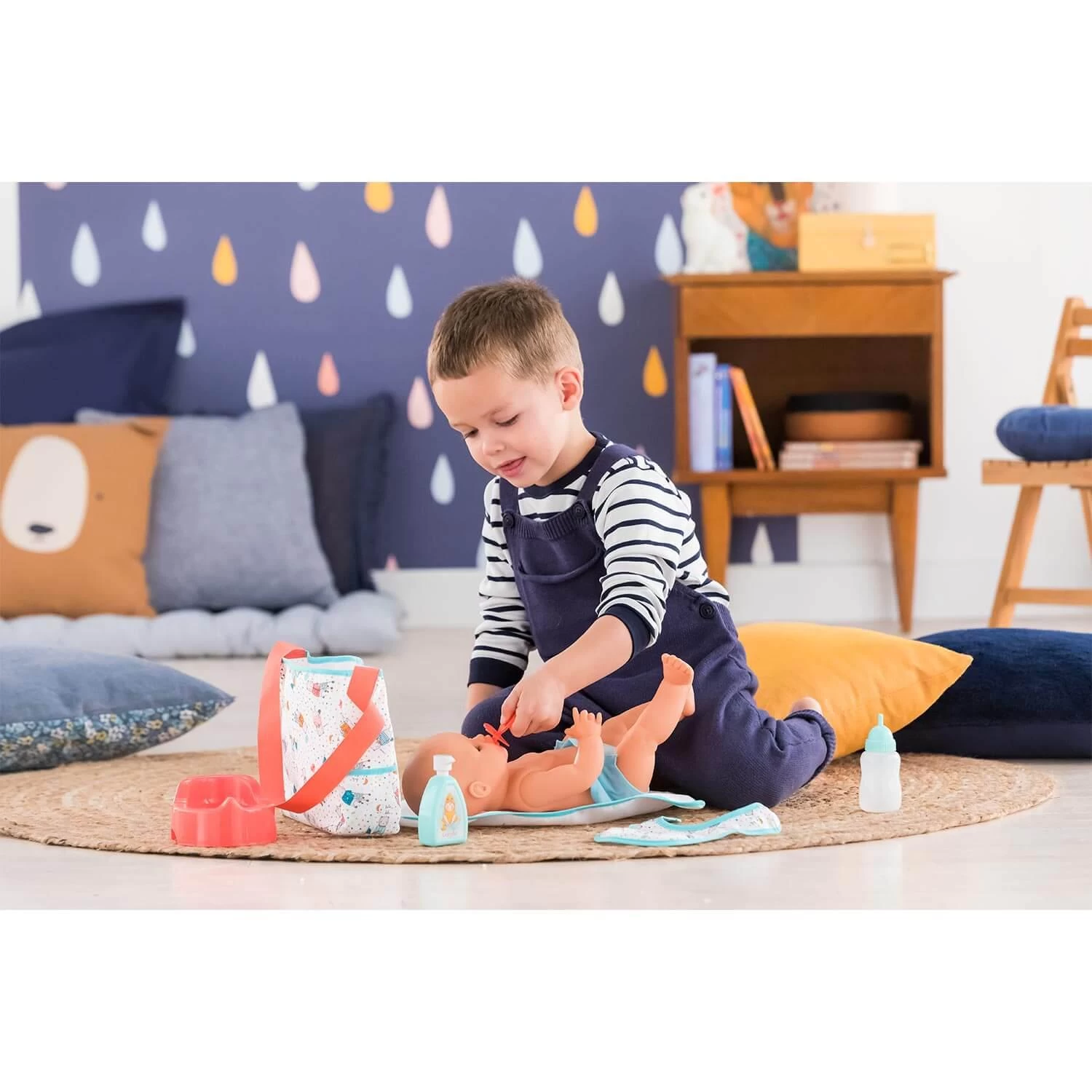 Le Sac à langer et Accessoires propose tous les éléments pour changer son grand poupon : un lait de toilette, une couche en tissu, un biberon, un bavoir, une tétine, un pot et un sac à langer 2-en-1 (tapis à langer et sac à langer).
