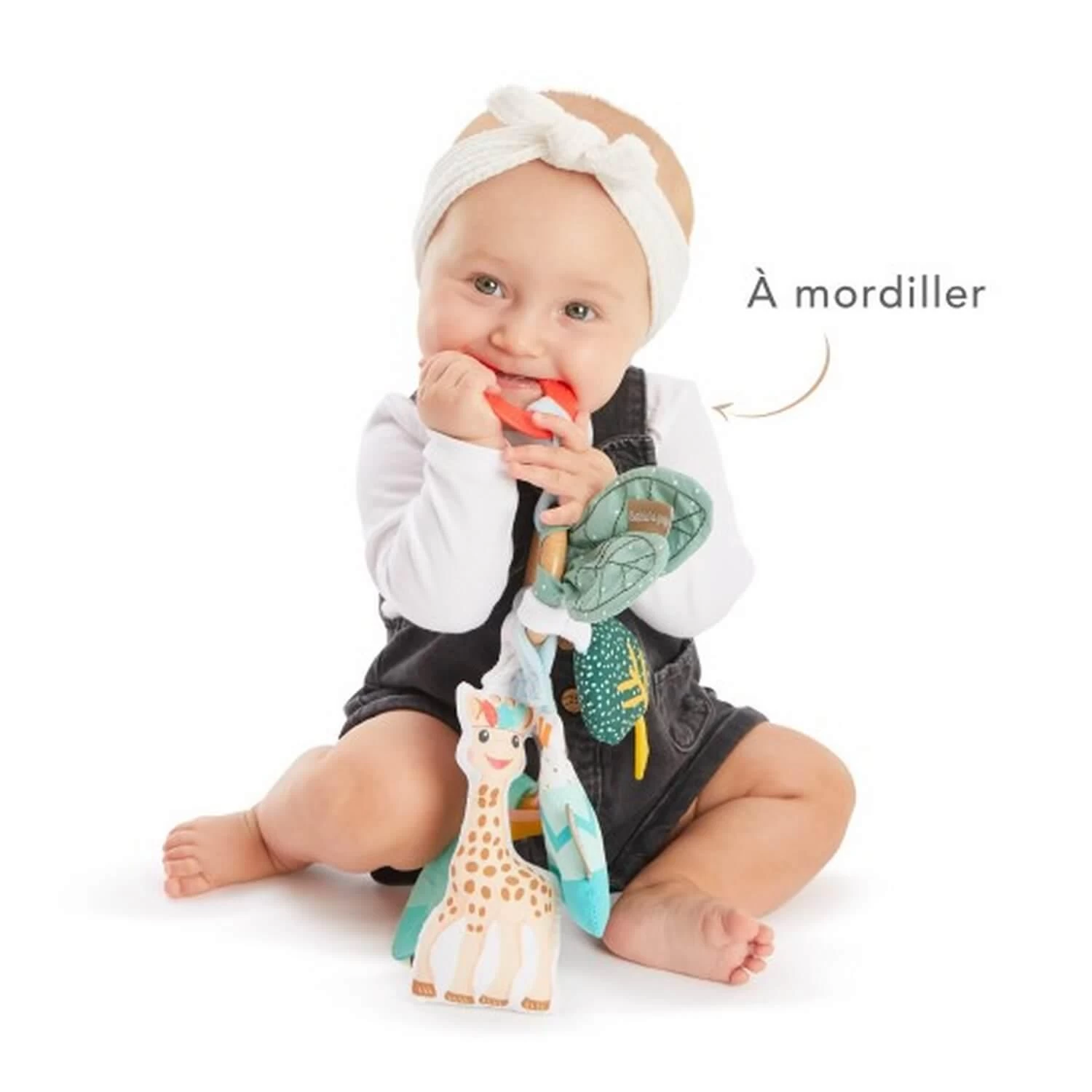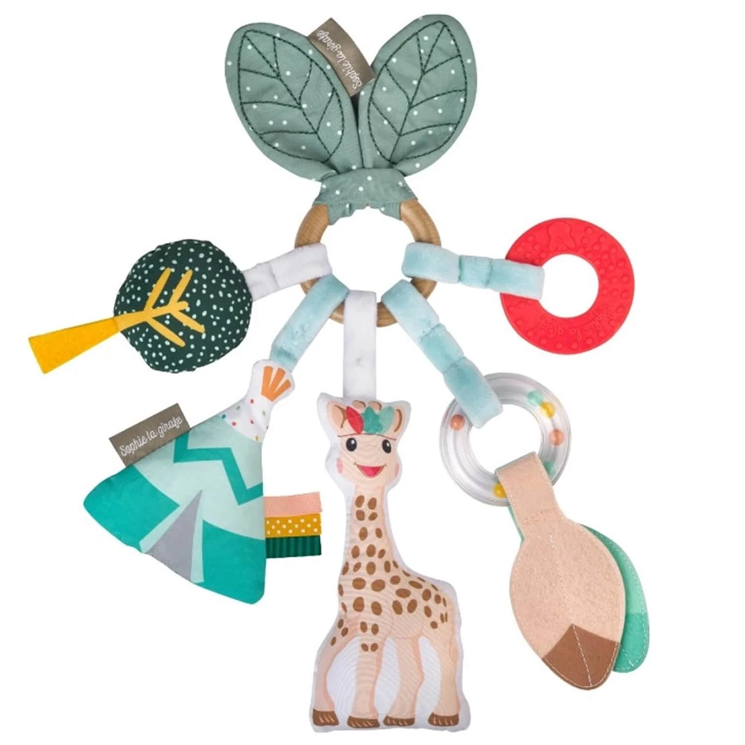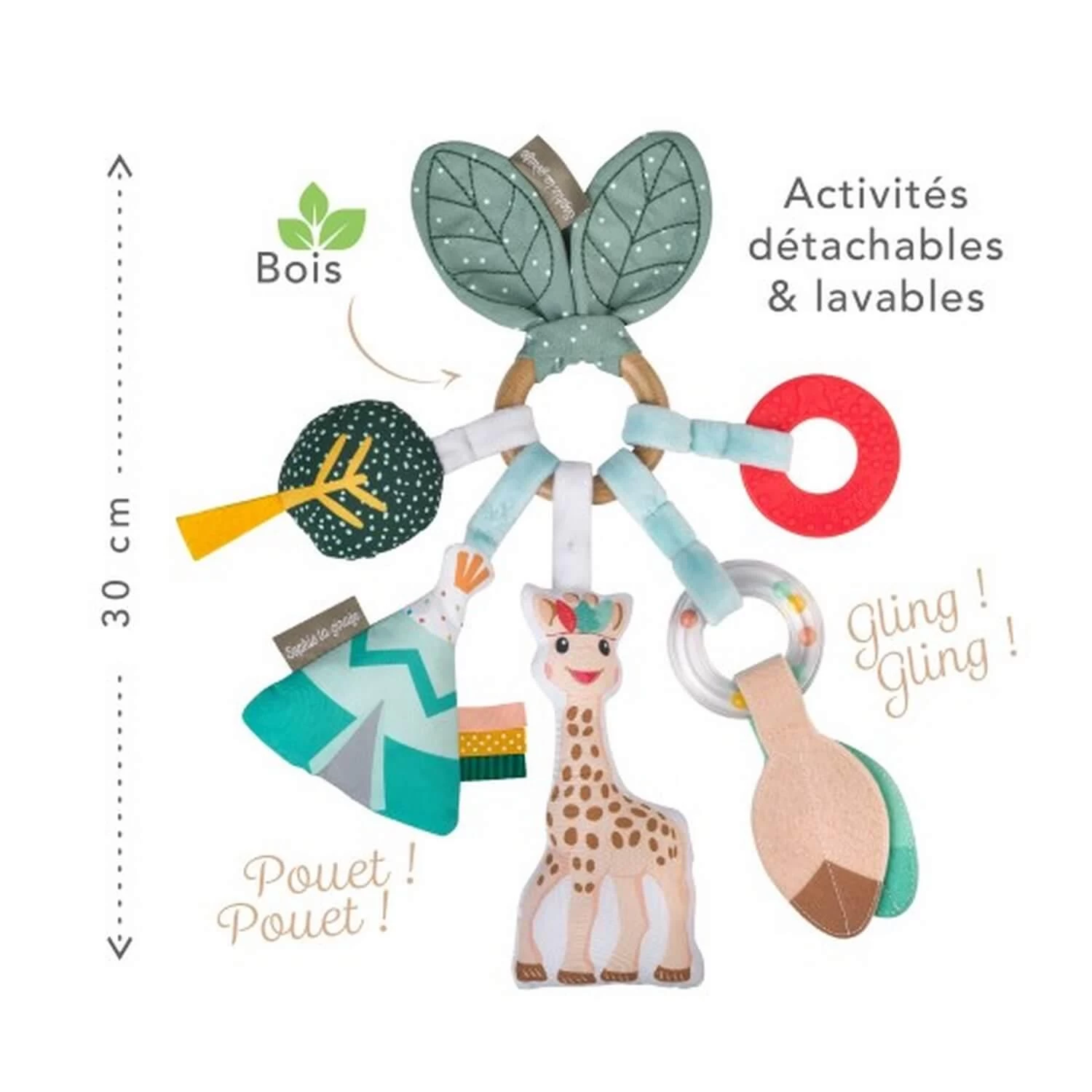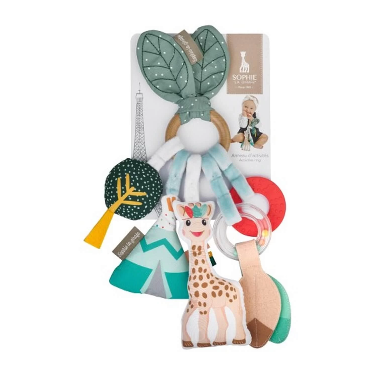 Anneau d’activités en bois et tissu a l’effigie de Sophie la Girafe pour des moments de jeux et d’éveil.