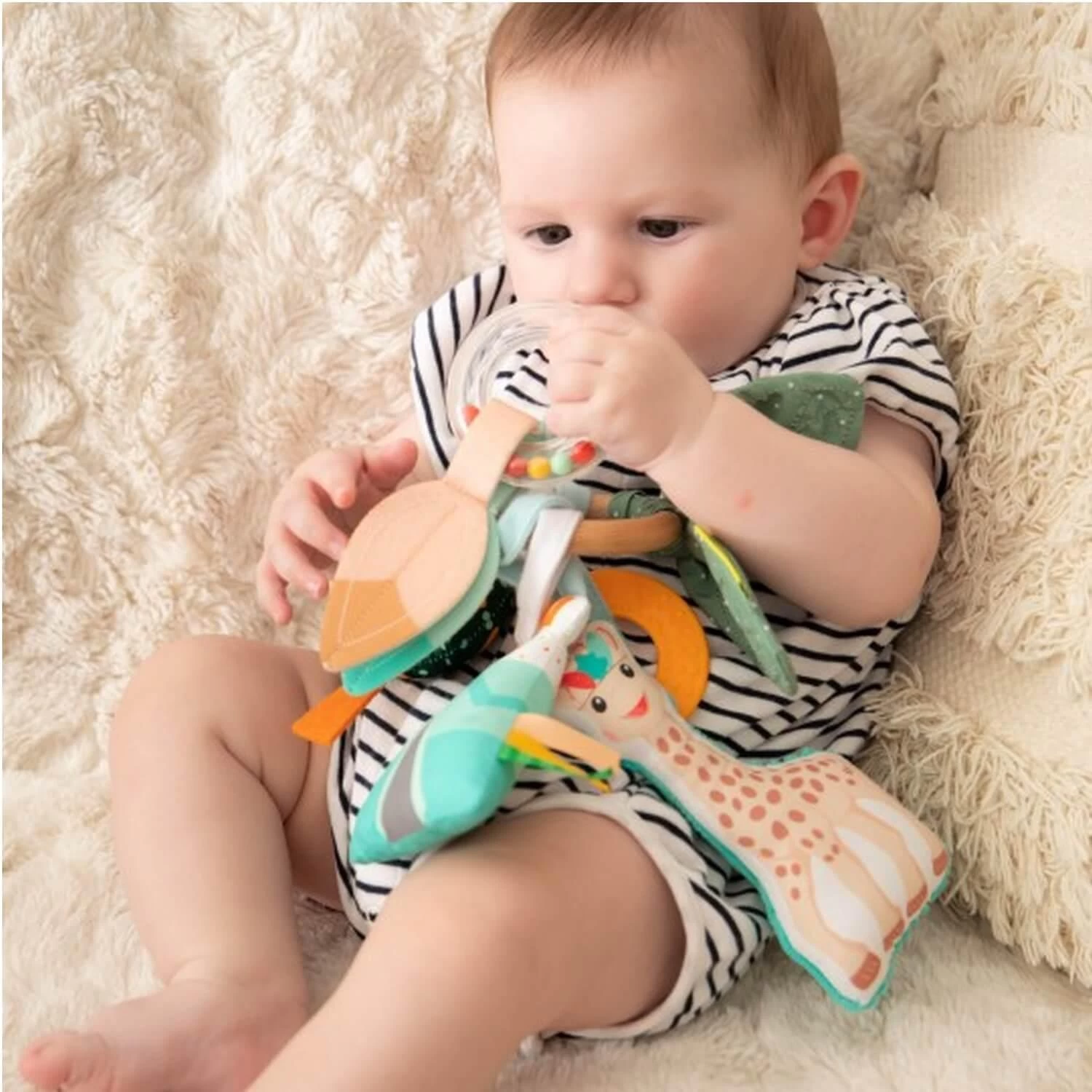 Bébé développe ses sens et sa motricité grâce à la multitude d’activités autour de l’anneau central en bois : hochet transparent, sifflet, grelot, papier froissé, étiquettes, anneau de dentition…