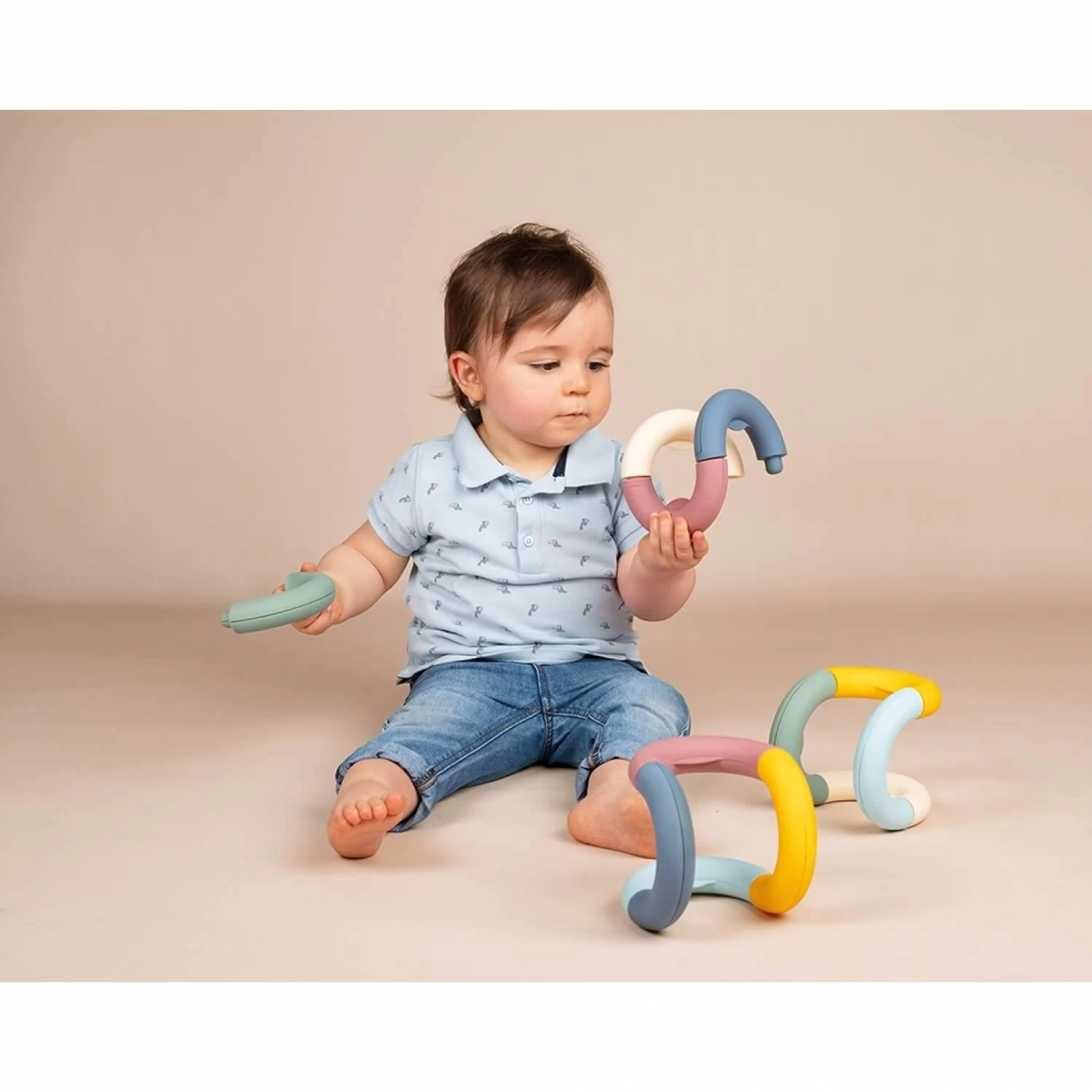 La forme épurée et originale du jouet est parfaitement adaptée aux mains des tout-petits.