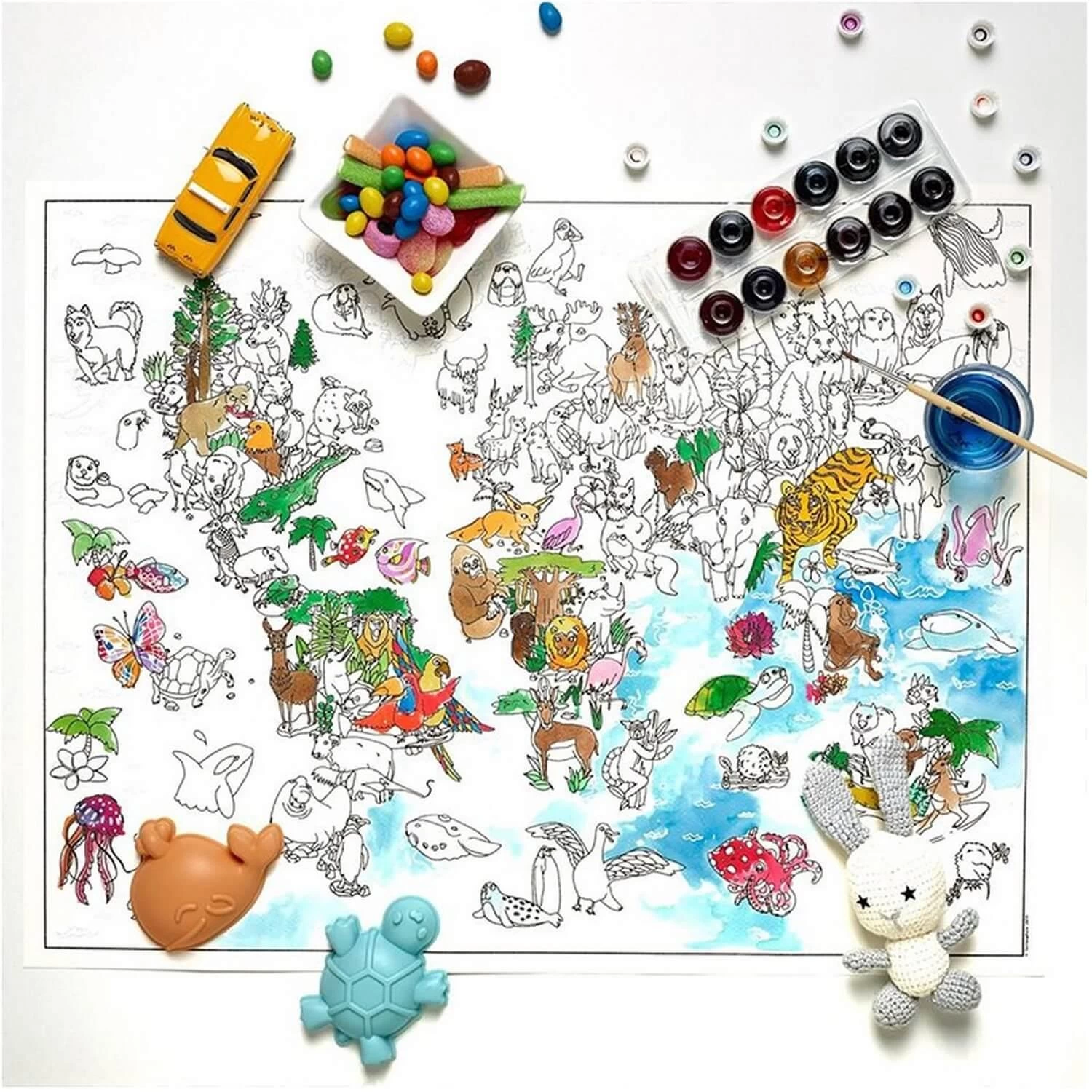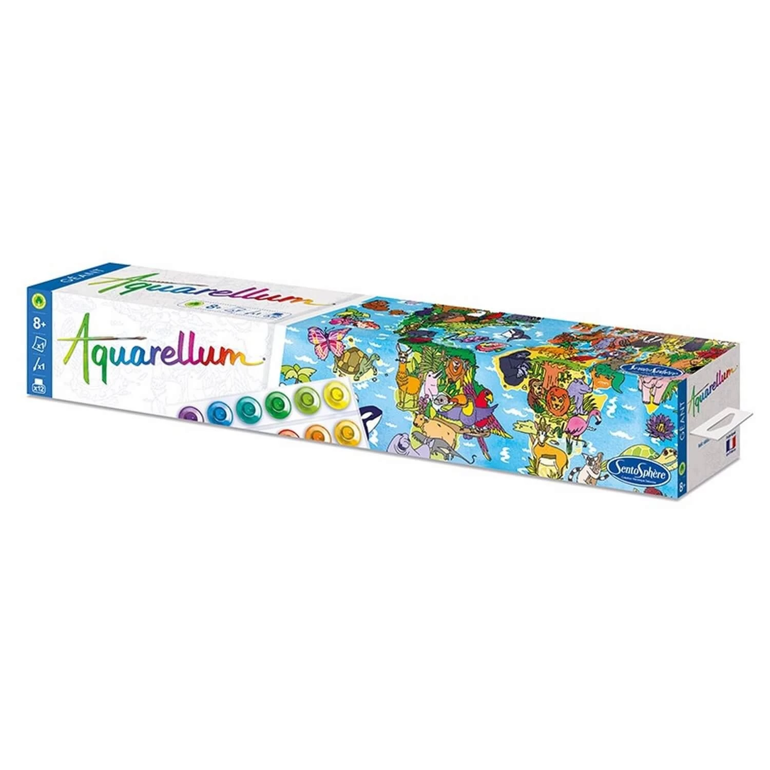 Grâce à ce coffret, faites le tour du monde en quelques coups de pinceau en peignant ce planisphère grâce aux 12 encres aquarelles fournies. Ce format géant peut être mis en couleur seul, ou à plusieurs, pour partager les plaisirs de la technique Aquarellum ! Vos enfants pourront découvrir les animaux des quatre coins du monde en leur donnant vie sur un format géant.