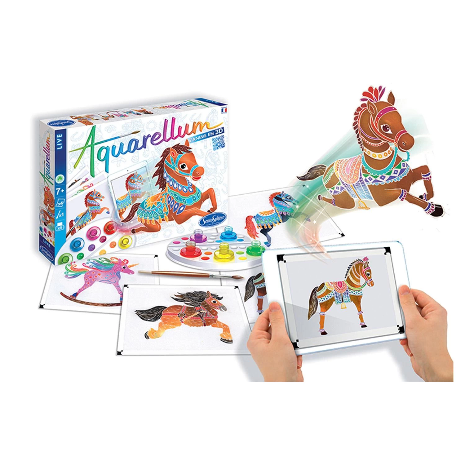 Aquarellum sâanime en 3D ! AprĂšs avoir peint les 4 chevaux du coffret en profitant de la technique magique dâAquarellum de SentosphĂšre, scanne-les grĂące Ă une application qui donnera vie Ă tes mises en couleurs et te permettra de te prendre en photo avec !