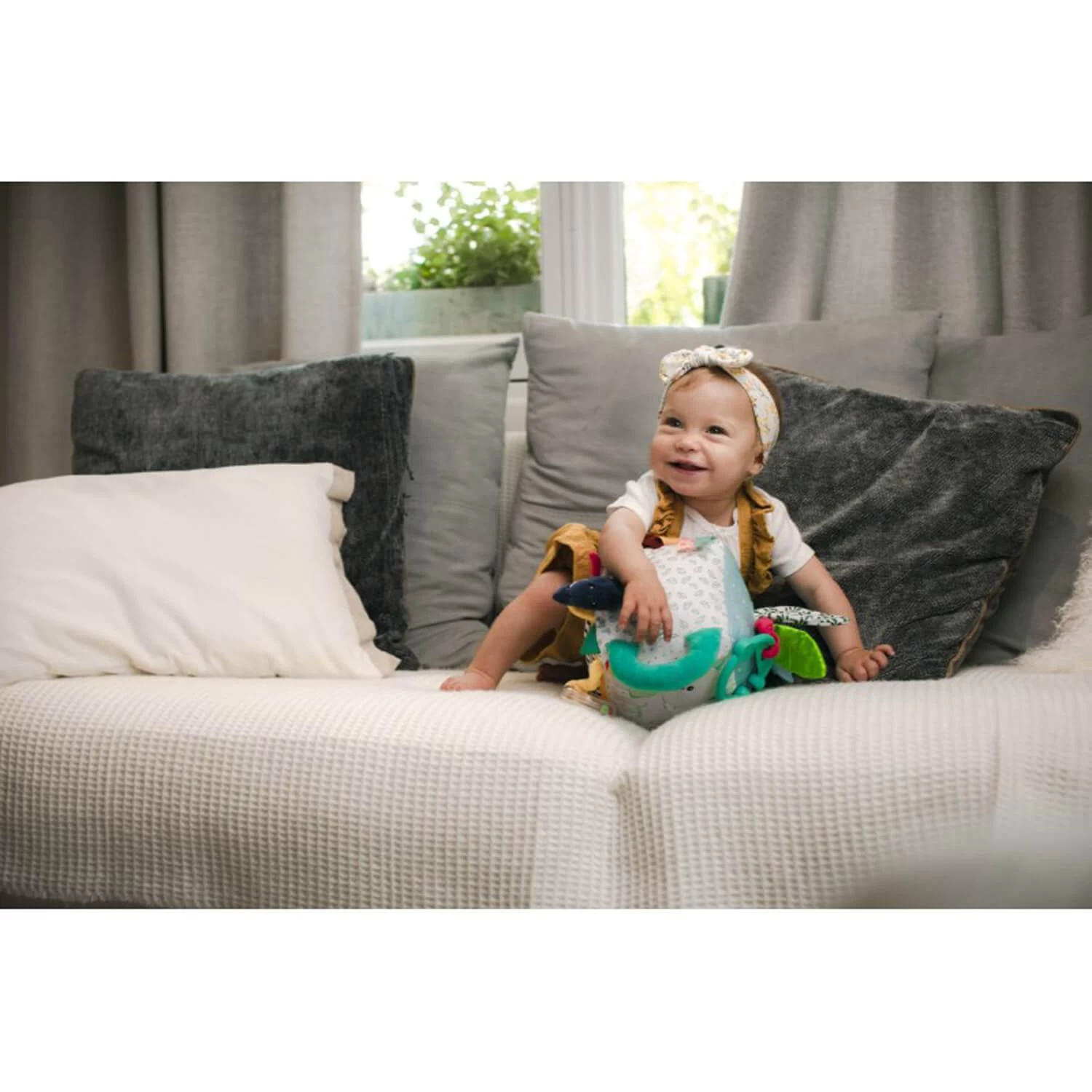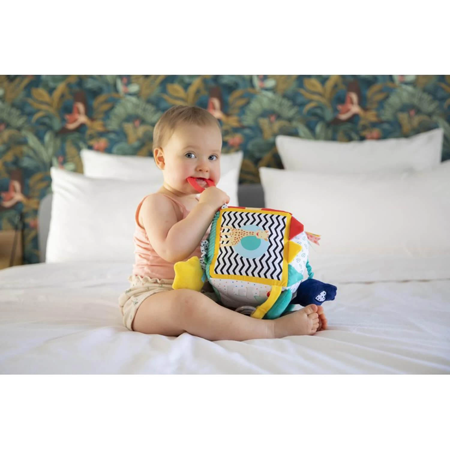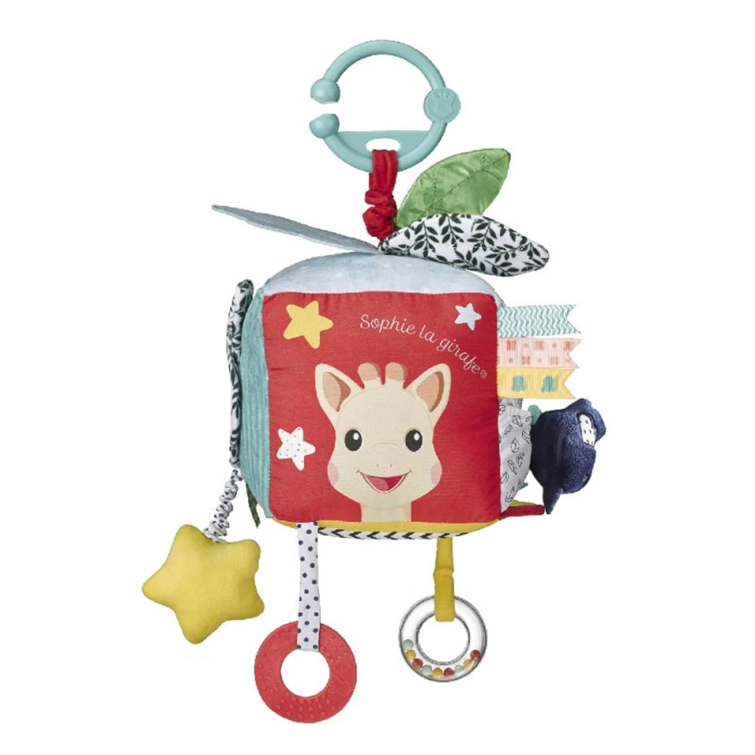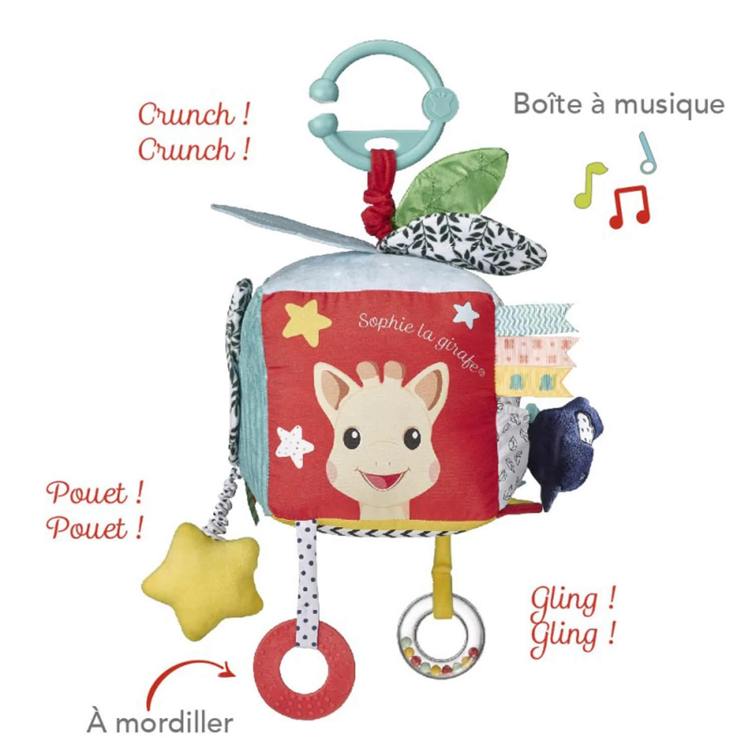 Un maxi cube textile, à l’effigie de Sophie la girafe, à la fois boîte à musique et cube d’activités.