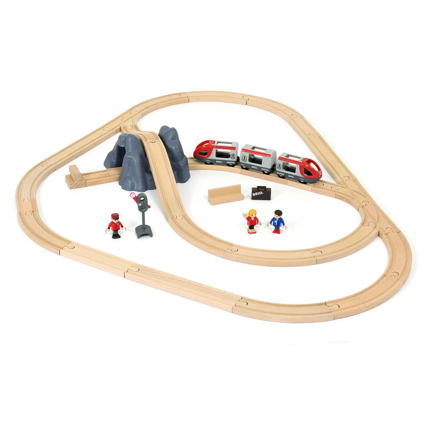Ce coffret Brio pour les passionnés de train à partir de 3 ans comprend 26 éléments de nature diverses : une locomotive, deux wagons, une figurine de conducteur, deux figurines de passagers, un tunnel, un feu, 17 rails de formes et de tailles diverses.