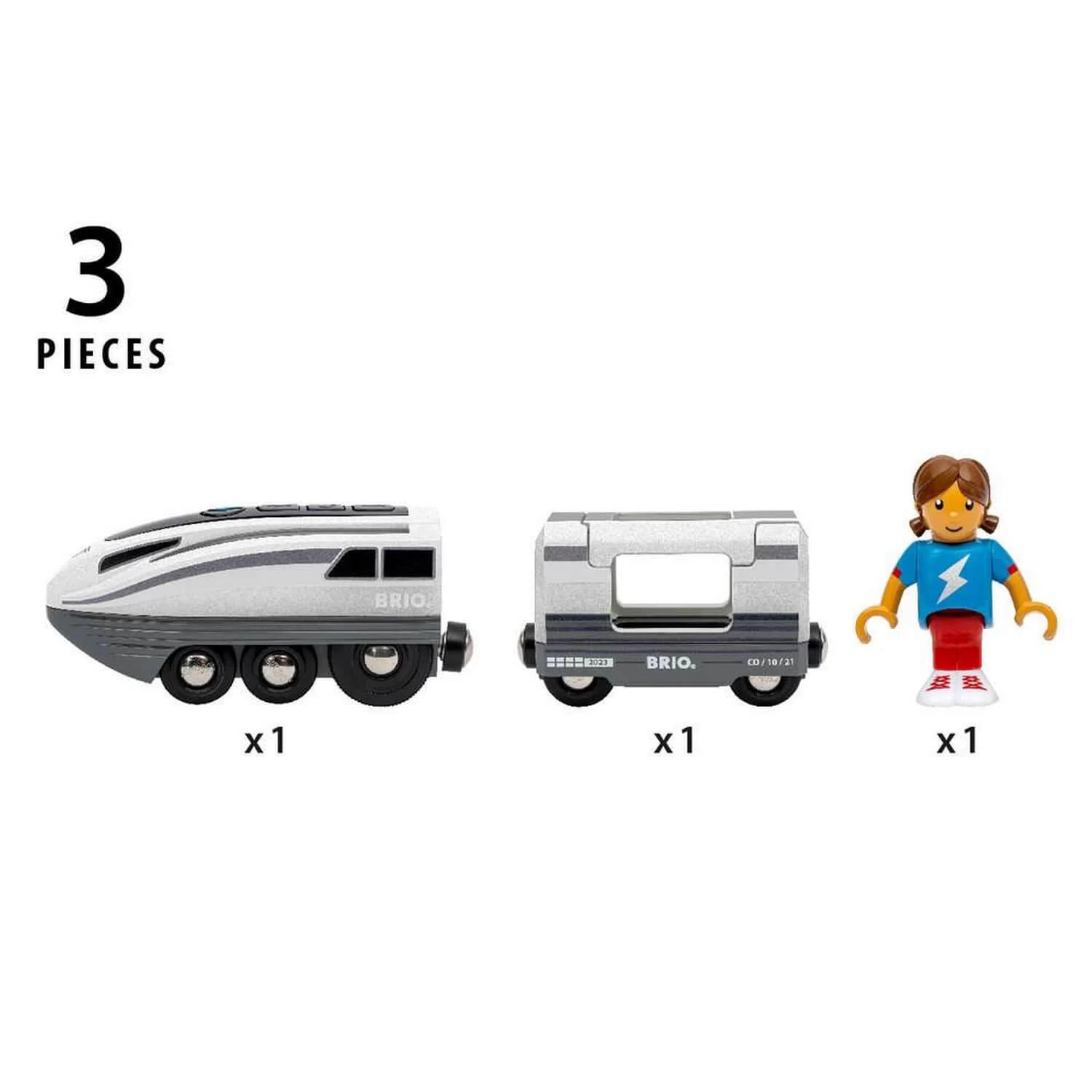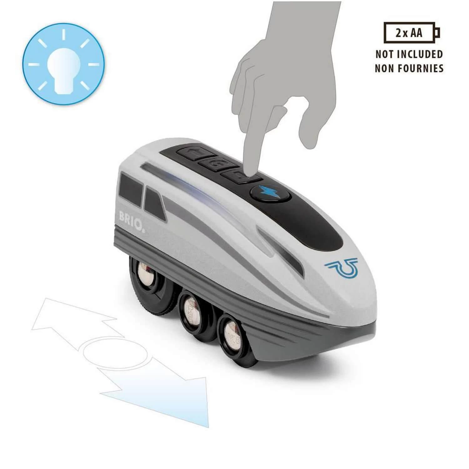 Passez à la vitesse supérieure avec la locomotive à piles Super Rapide. Il vous suffit d’appuyer sur le gros bouton turbo et ce train à piles va deux fois plus vite, ce qui fait de lui le train le plus rapide du BRIO World. La poussée turbo dure 5 secondes et, tandis que le train va à toute vitesse, les lumières blanches sur les côtés de la locomotive deviennent bleues. Cette locomotive à l’allure futuriste dispose d’un wagon qui accueille un passager chanceux de profiter du voyage.