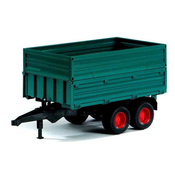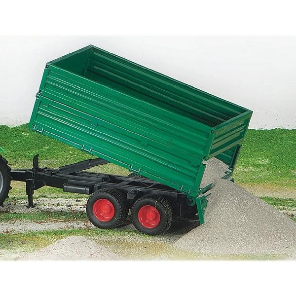 Remorque basculante avec stabilisateur au niveau de l’attelage. La porte arrière s’ouvre pour permettre l’épandage de l’engrais. Les parois du niveau supérieur sont amovibles