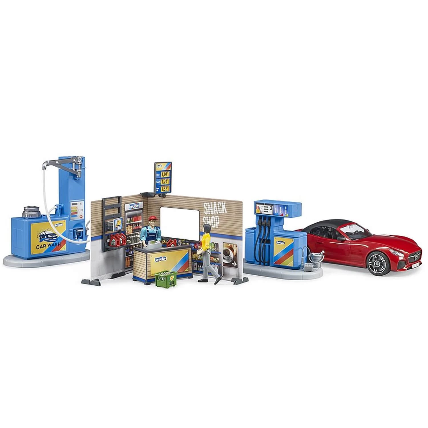 Presque tous les véhicules Bruder doivent être ravitaillés en carburant et nettoyés régulièrement. Pour ce faire, rien de mieux que la nouvelle station-service bworld avec ses équipements ultra-modernes. Tous les types de carburants courants y sont disponibles ainsi qu’une station de recharge pour les véhicules électriques. Le pompiste travaille dans un espace de vente moderne équipé d’ un tableau des prix, d’un écran et d’une caisse moderne.