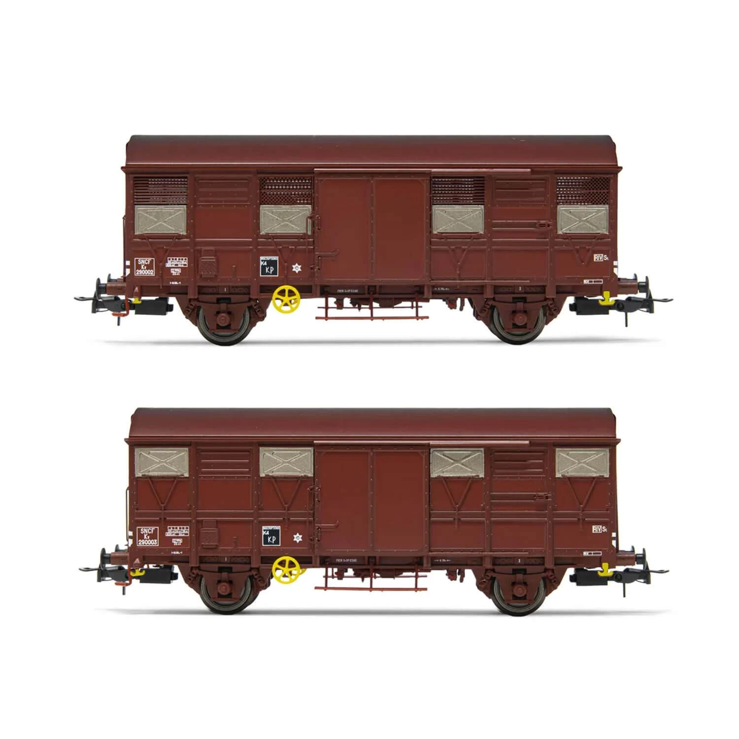 Belle reproduction de 2 wagons SNCF fermés à 2 essieux Kv Permaplex, avec volets ouverts. Coloris marron