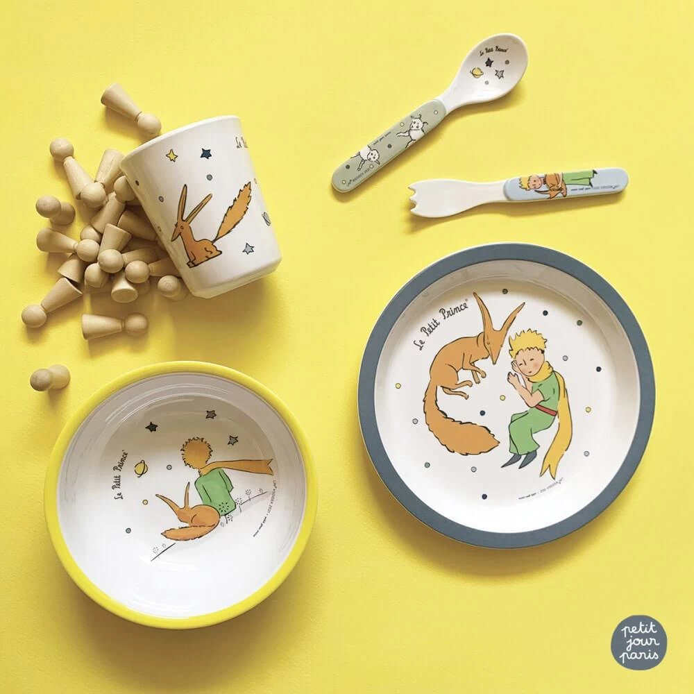 Ce set en mélamine, avec rebords ergonomiques pour aider l’enfant à prendre les aliments et manger presque tout seul, est joliment illustré à effigie du personnage poétique Le Petit Prince de Saint-Exupéry. Il est composé d’une assiette, d’un bol, d’une timbale et d’un set de 2 couverts adaptés aux petites mains.