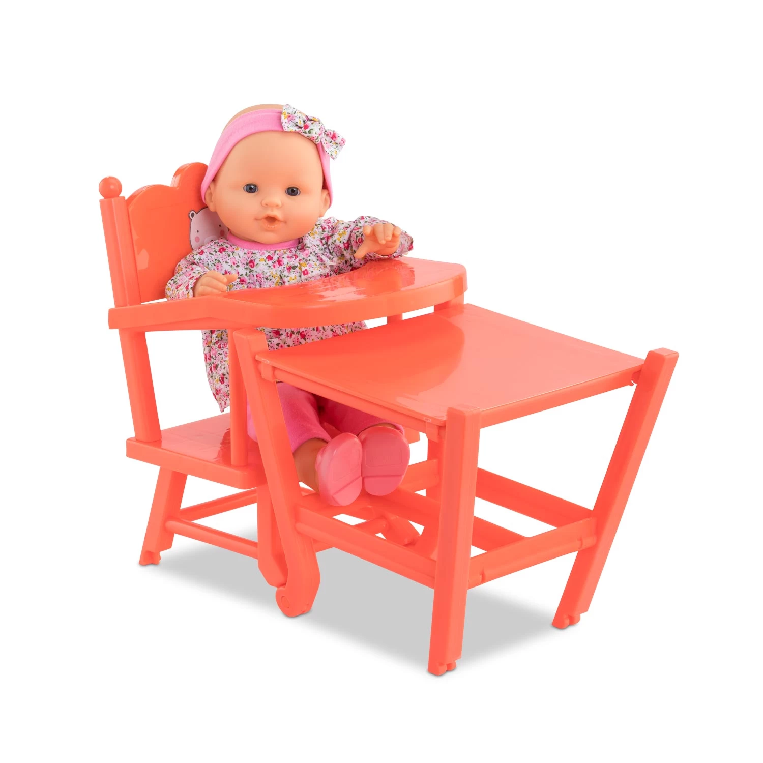 1 en 1 : position haute comme une vraie chaise et position basse pour jouer assis. Pour donner à manger à son grand poupon de 36 à 42cm. Dès 3 ans. À table ! La Chaise Haute est adaptée aux grands poupons de 36 à 42cm Corolle. Elle est 2 en 1 : elle se place en position haute comme celle d’un vrai bébé ou en position basse pour faciliter le jeu assis. Sur sa petite tablette, on peut poser le repas de son grand poupon.