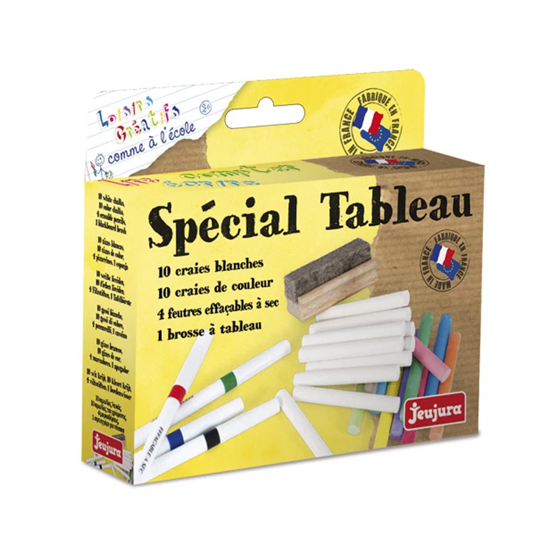 La marque Jeujura vous propose un coffret de craies et feutres avec brosse pour le tableau d’un enfant. Le set est très complet et sera un complément idéal pour un tableau d’enfant. Qu’il soit noir ou blanc, l’enfant sera équipé.