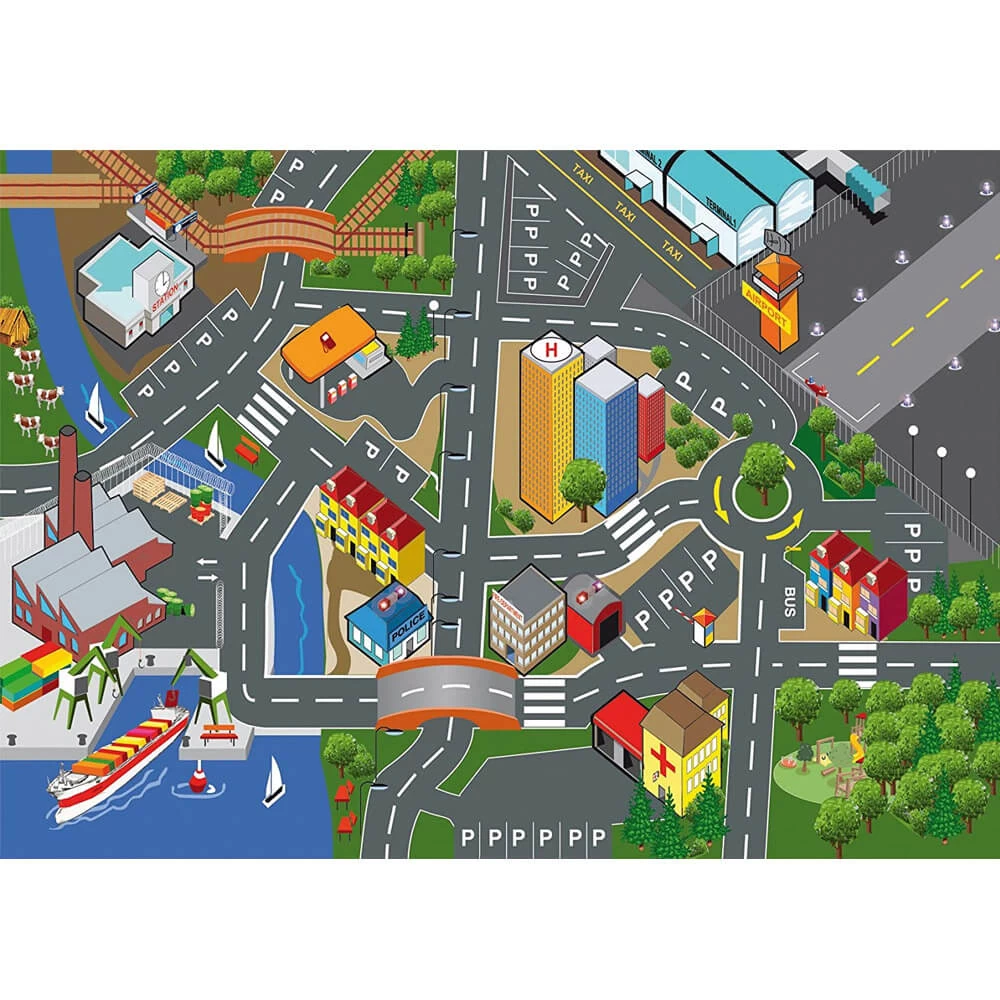 Avec ce tapis circuit imprimé de dessins représentant des rues et des quartiers allant dans plusieurs directions, vous allez pouvoir vous inventer de nombreuses histoires avec fluidité du trafic ou non… De grand format, il permet de déployer tout votre parc de véhicules.