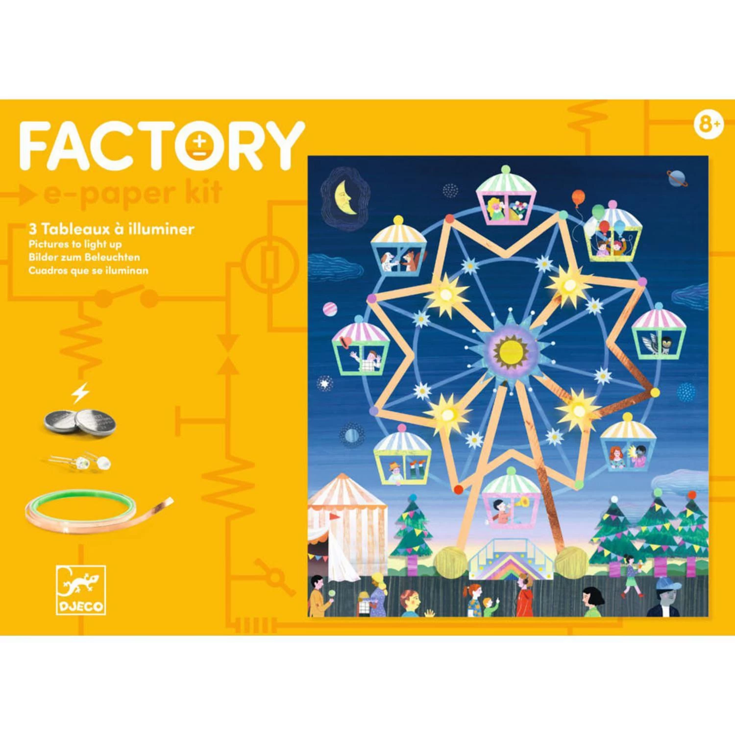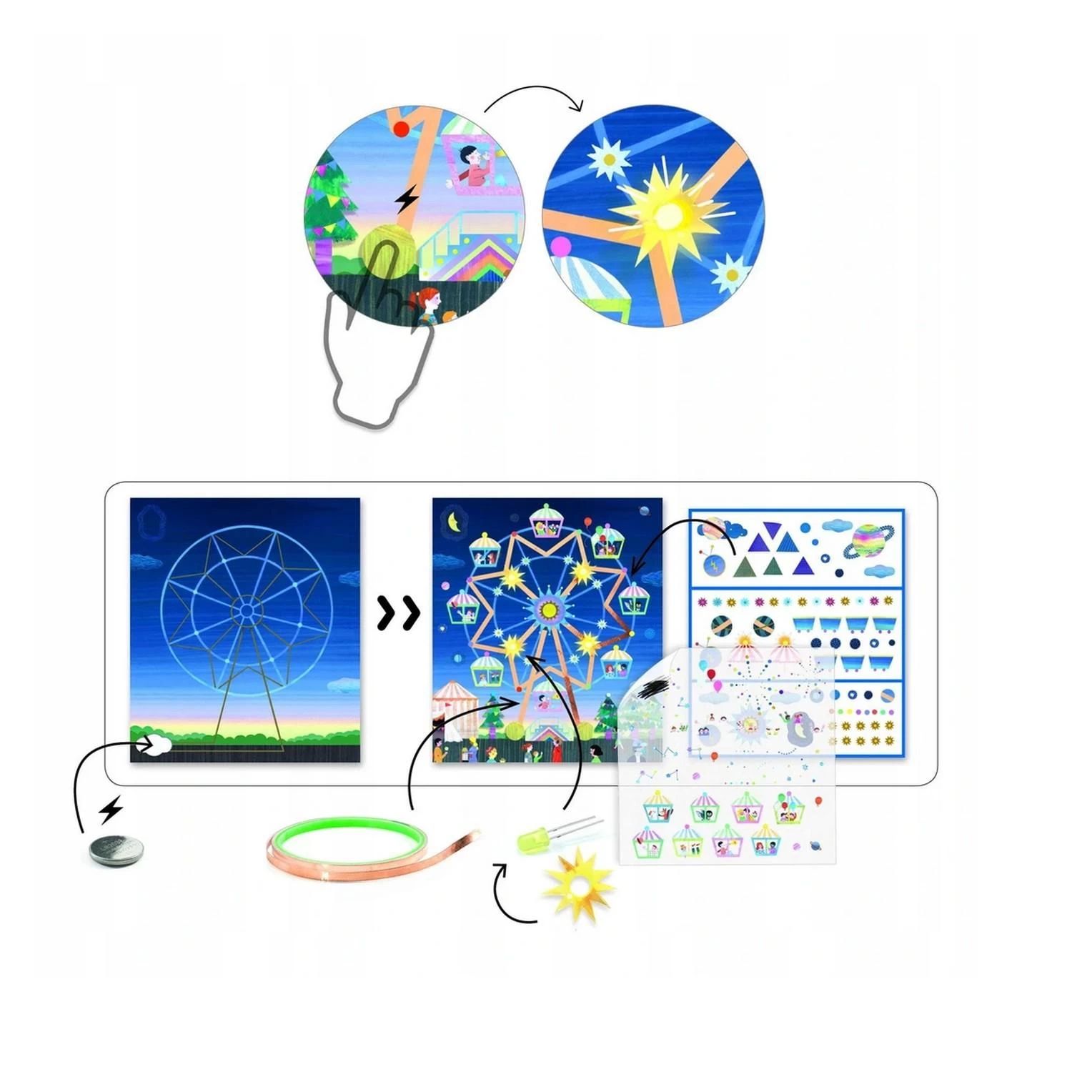 Factory, une gamme pour appréhender la technologie au travers des loisirs créatifs. Un coffret où l’enfant réalise trois jolis tableaux de fête foraine qui s’illuminent. Avec de l’adhésif conducteur, l’enfant trace les circuits électriques puis ajoute pile et LED en suivant les étapes pas à pas décrites dans le livret. Il personnalise ensuite ses réalisations avec les nombreux accessoires fournis.
