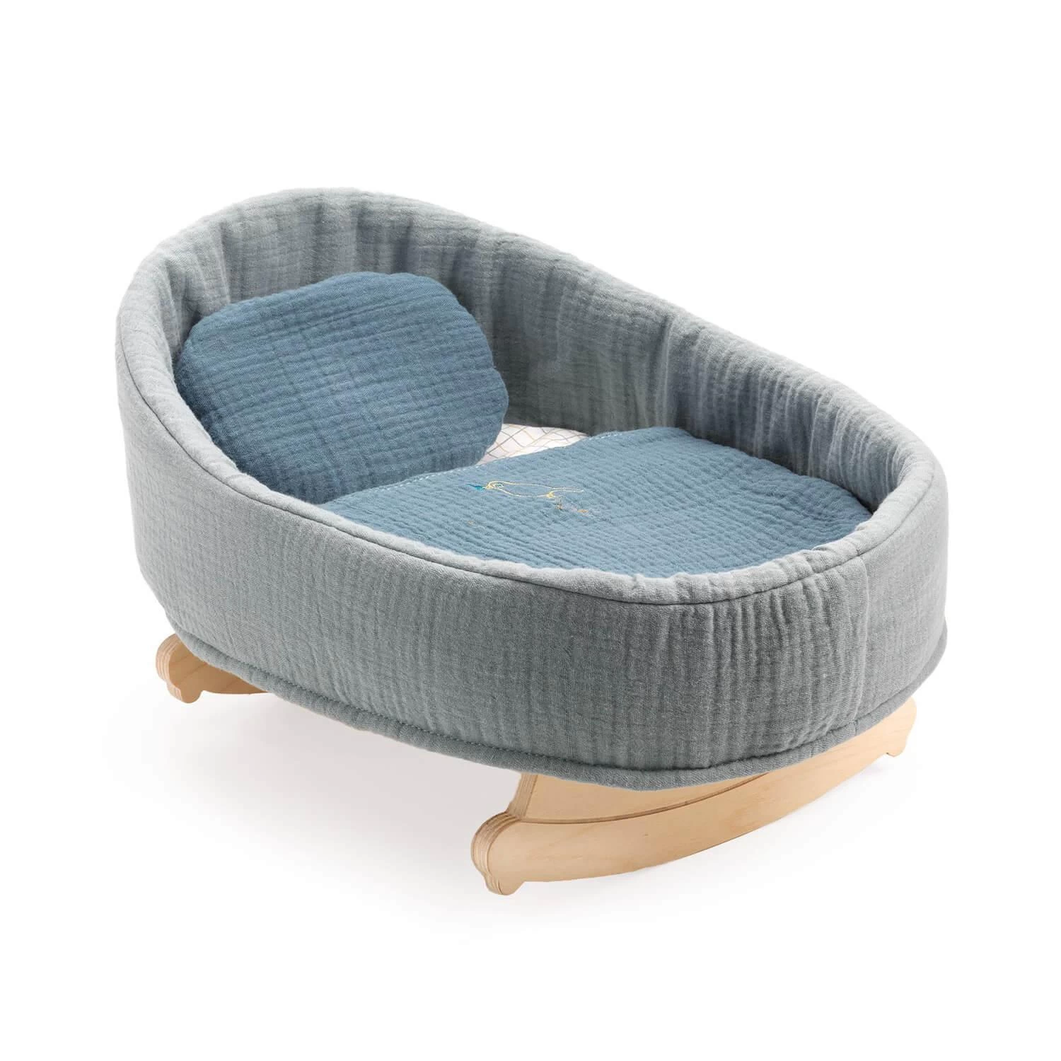 Un berceau à bascule pour poupée recouvert d’une housse bleue matelassée en double Gaze 100% coton.
