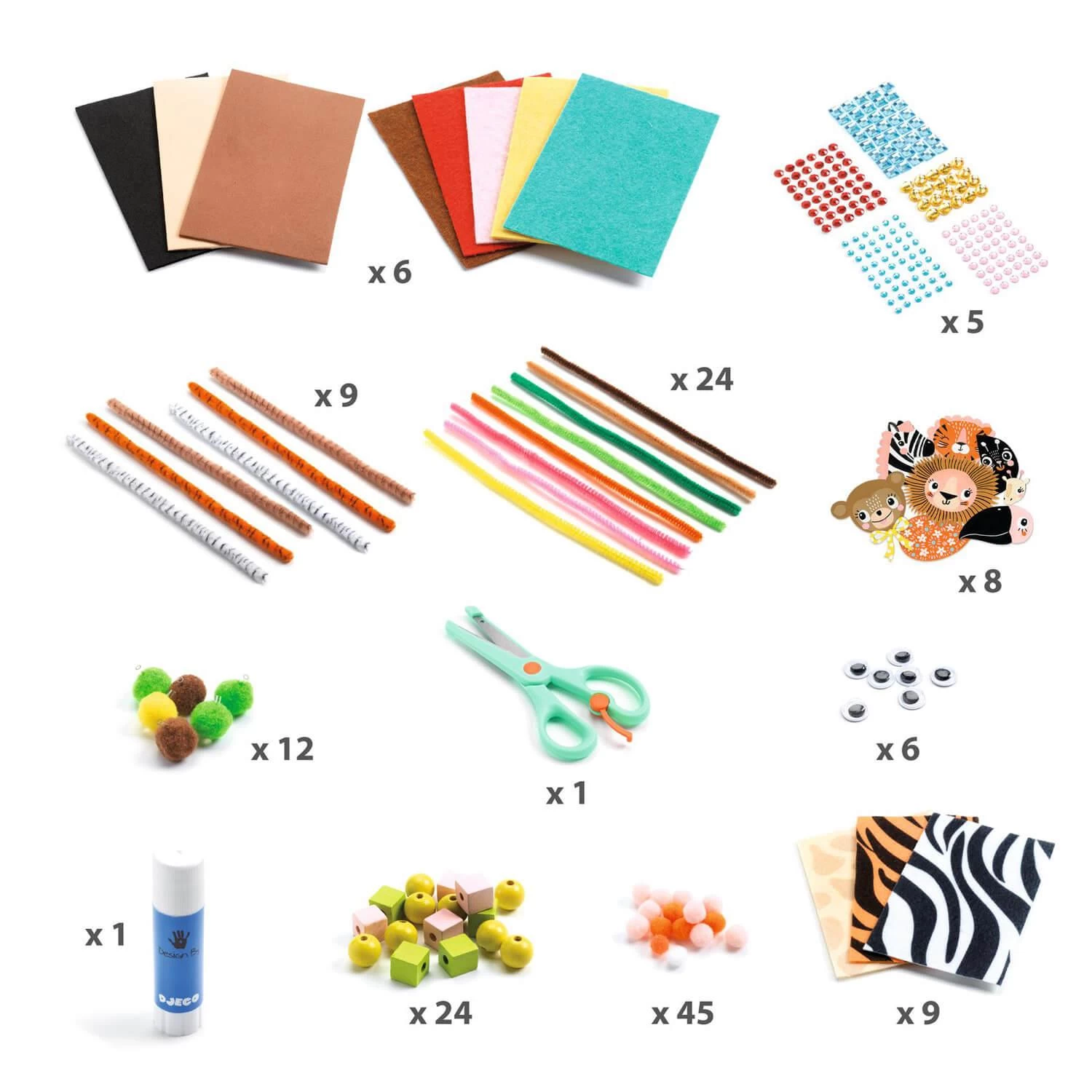 Contenu : 10 cartes prédécoupées et illustrées, 18 feuilles en feutrine, 6 feuilles en mousse, 24 perles en bois, 45 pompons, 33 fils chenilles, des bijoux autocollants, des yeux mobiles autocollants, 1 paire de ciseaux, 1 tube de colle + 10 fiches d’idées.