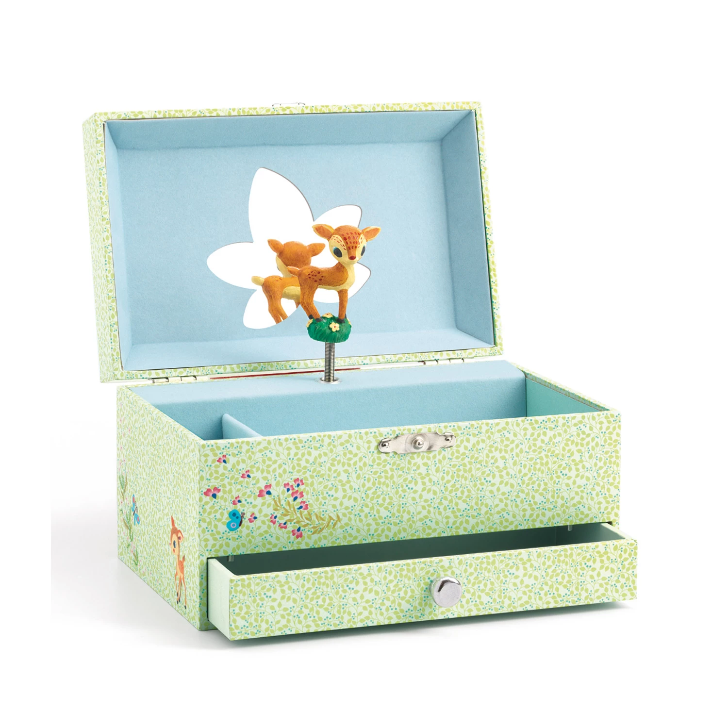 Ouvrez la boîte et admirez l’adorable faon tourner sur lui-même sur l’air des Histoires de la forêt viennoise de Johann Strauss. Cette boîte vous permettra de ranger tous vos bijoux, vos secrets et vos trésors.