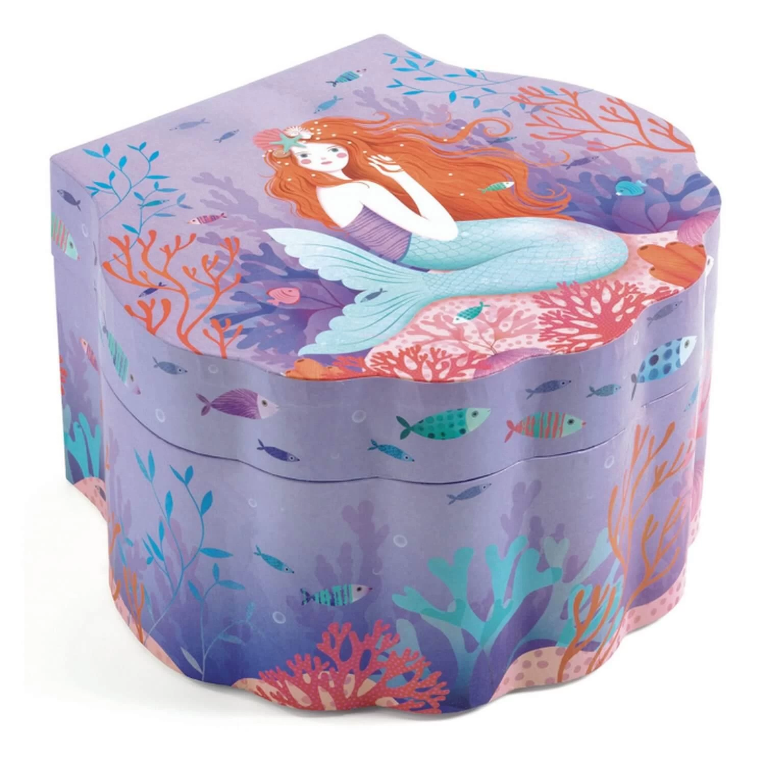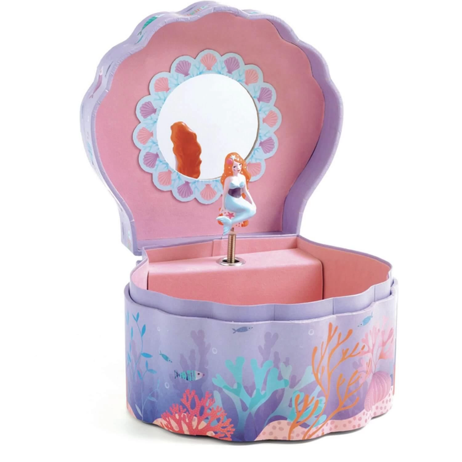 Découvrez la boîte à musique et à bijoux sur le thème des sirènes de la marque Djeco. Cette boîte en bois en forme de coquillage joliment illustrée permet aussi de ranger ses bijoux secrets.