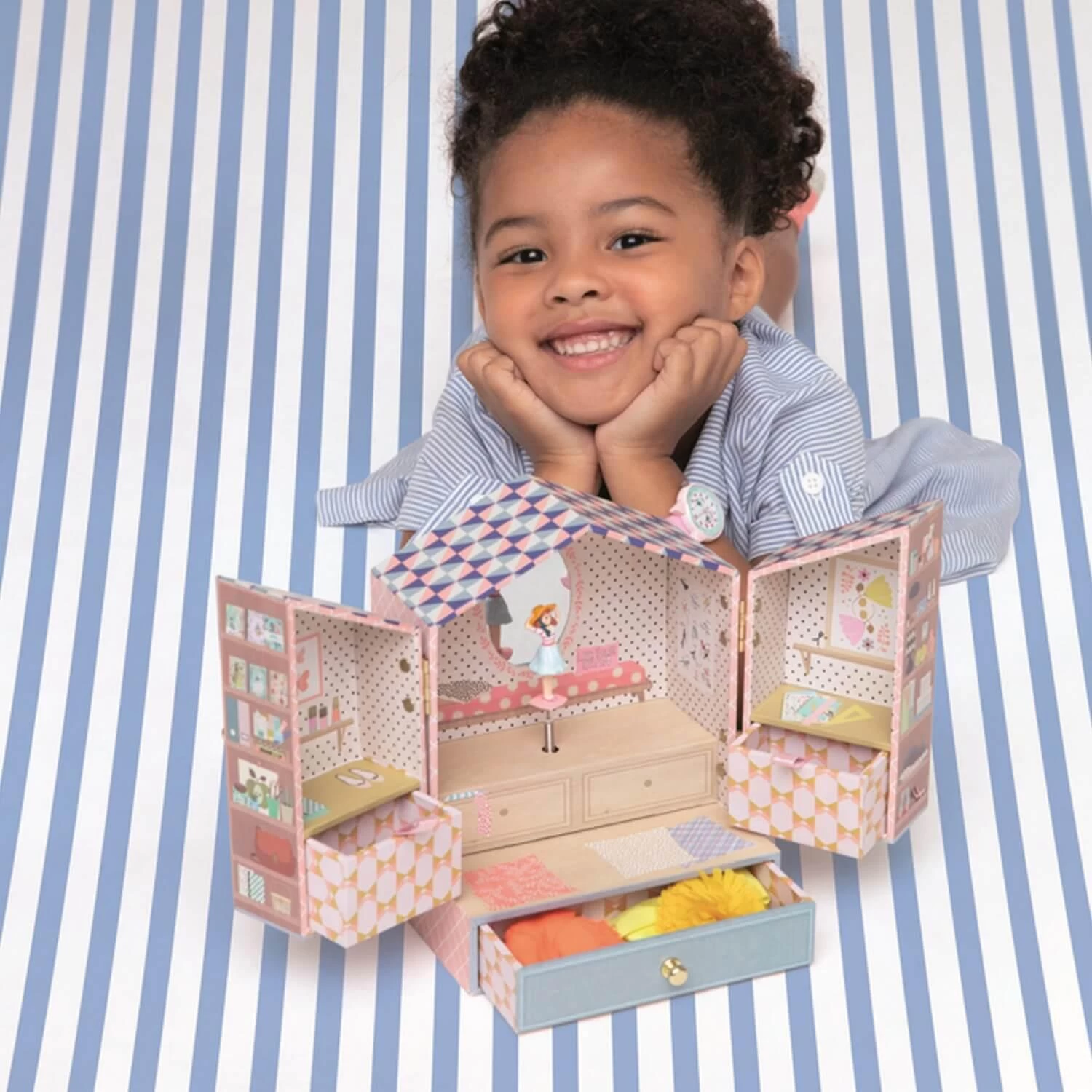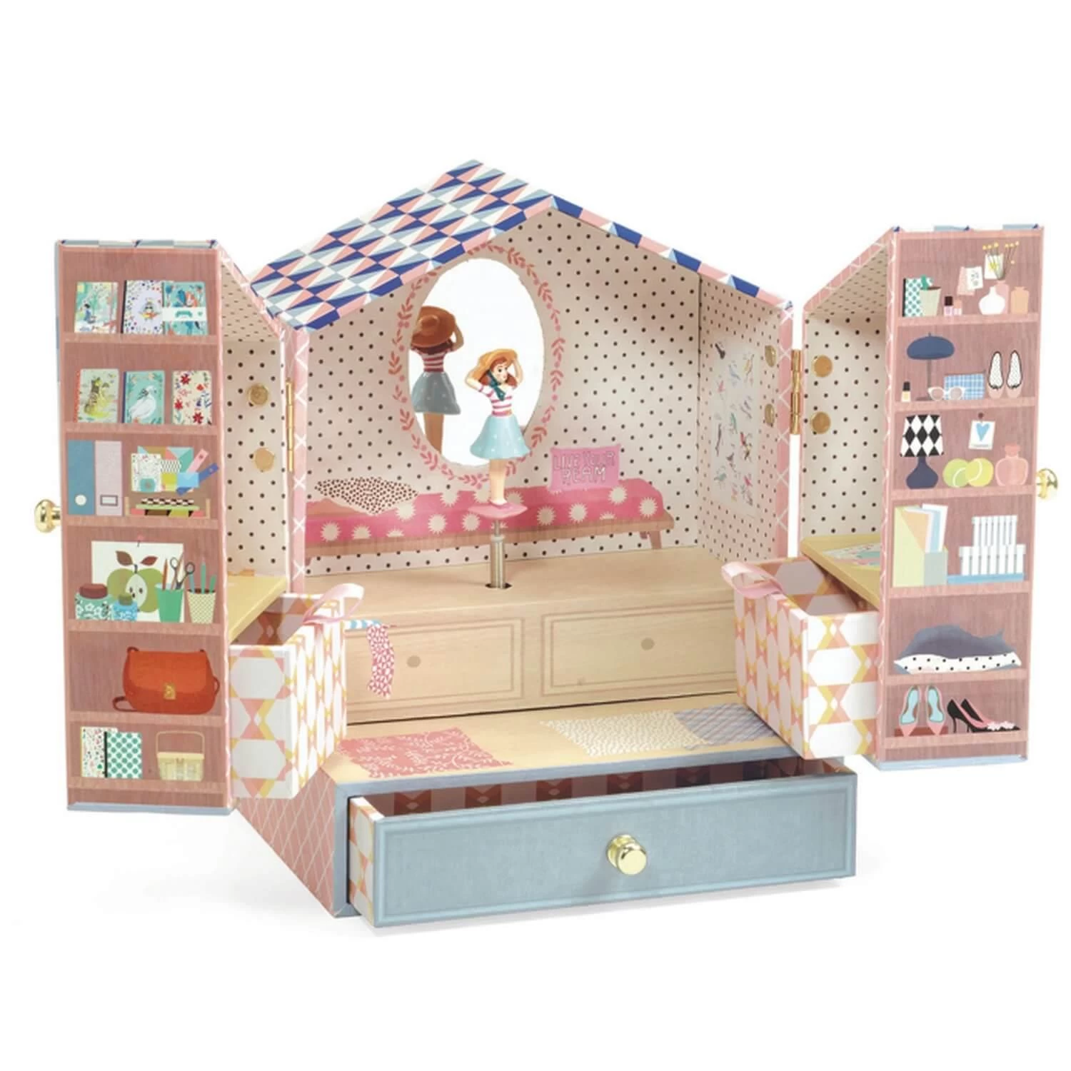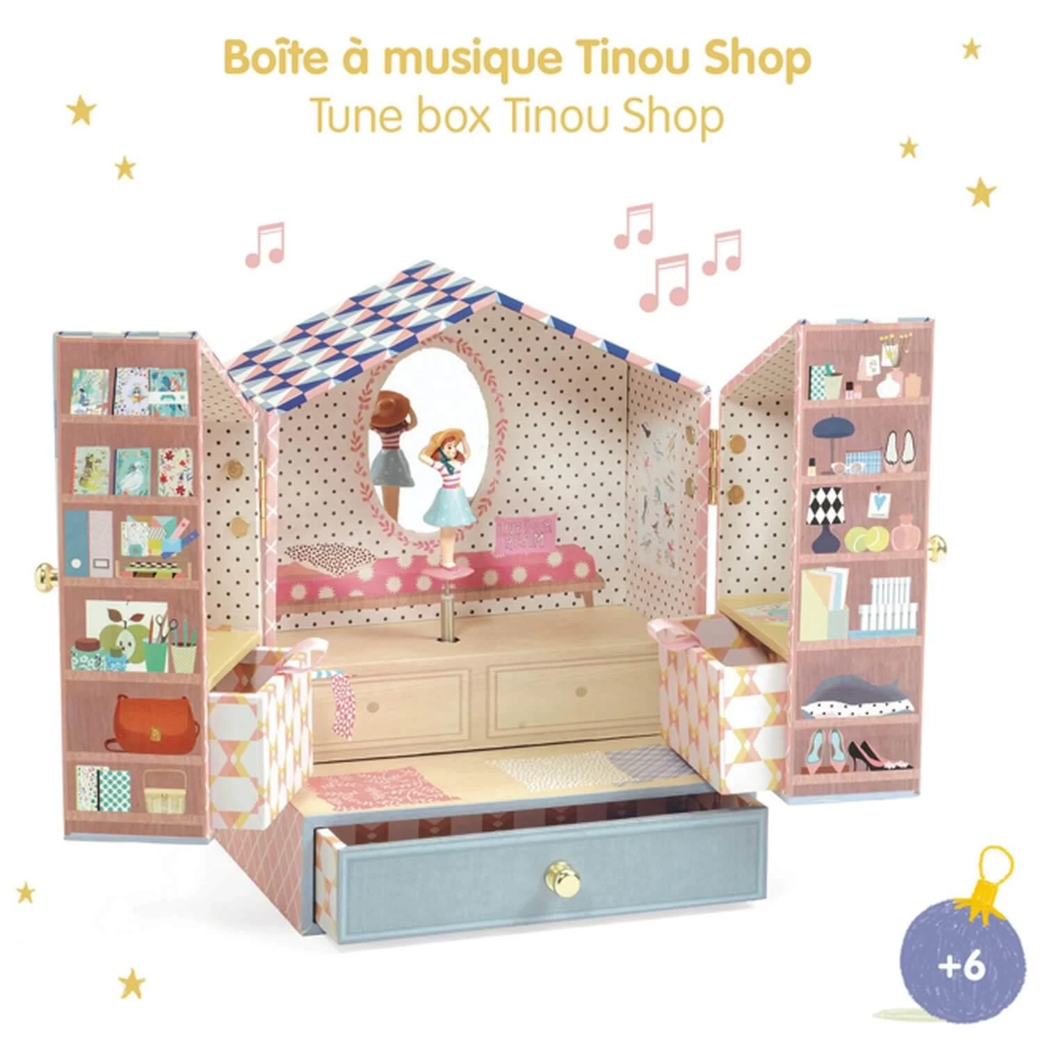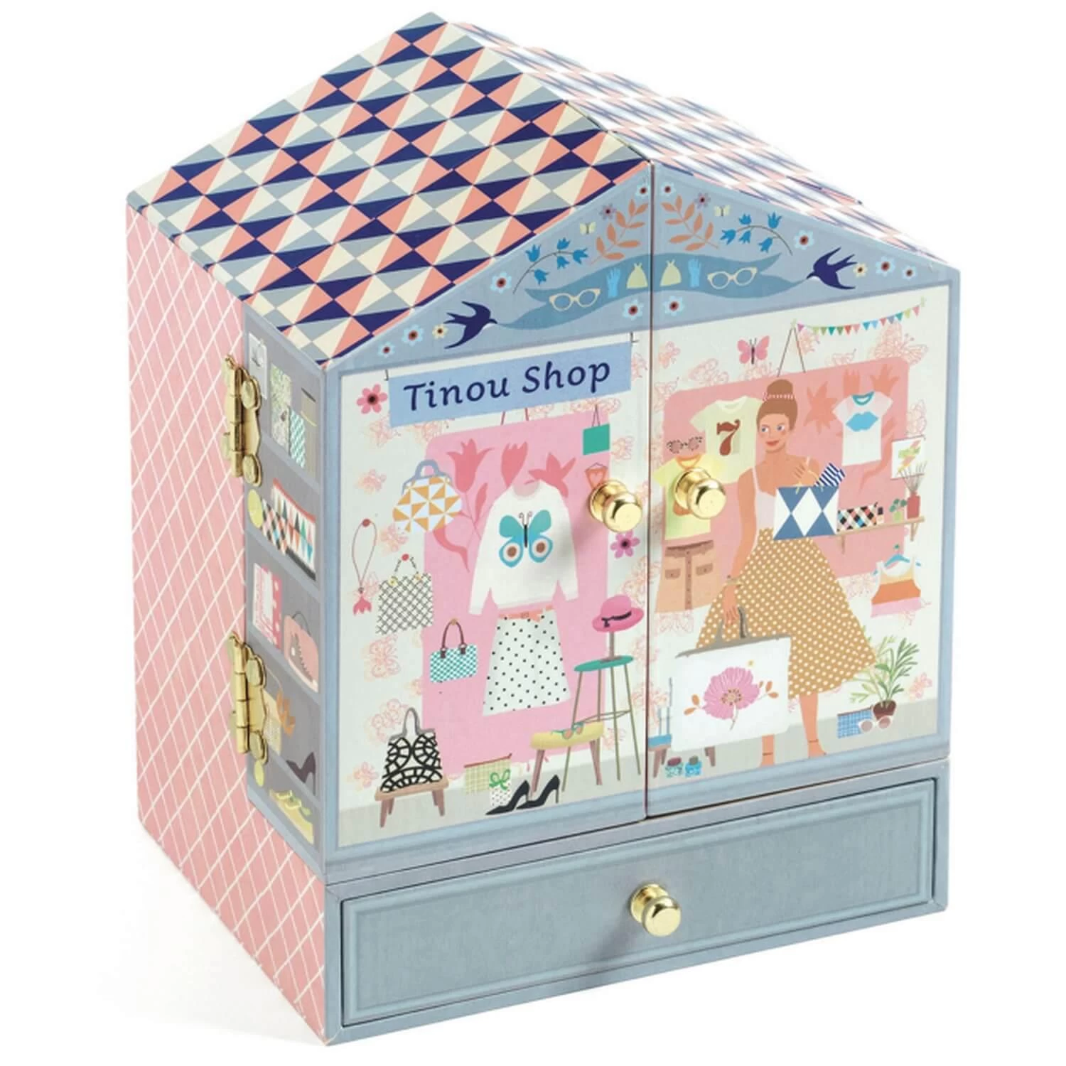 Découvrez la boîte à musique et à bijoux Tinou Shop de la marque Djeco. Une armoire à bijoux joliment illustrée avec 3 tiroirs pour y garder ses secrets en sécurité.