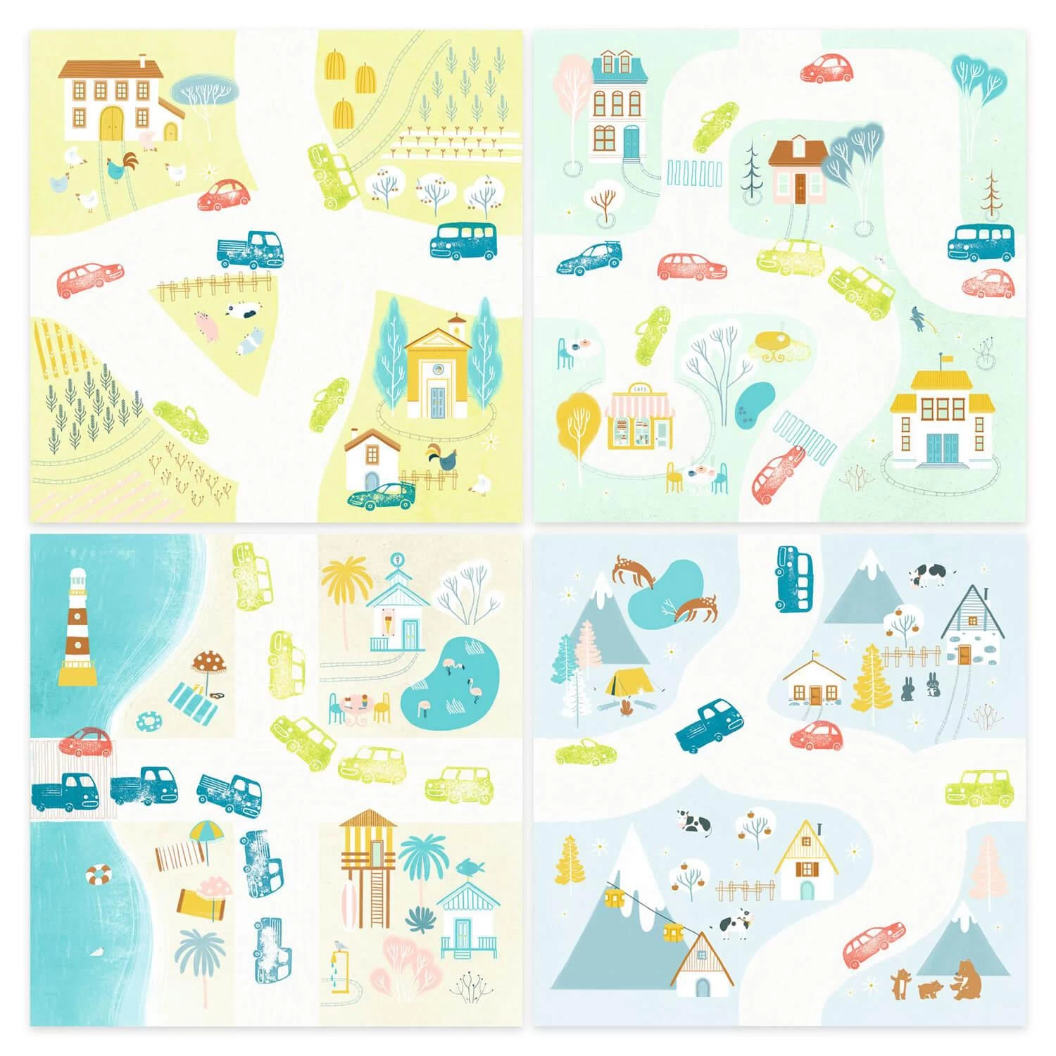 Progressivement, il encre les tampons et marque les empreintes pour animer les décors en laissant libre cours à son imagination. Les cartes s’assemblent pour créer de fabuleux parcours. En route !
