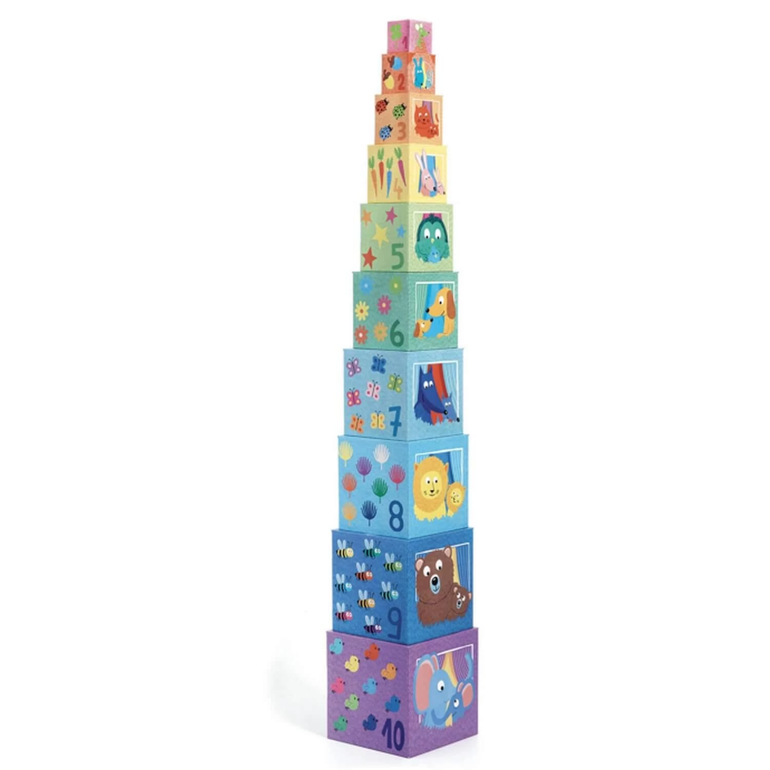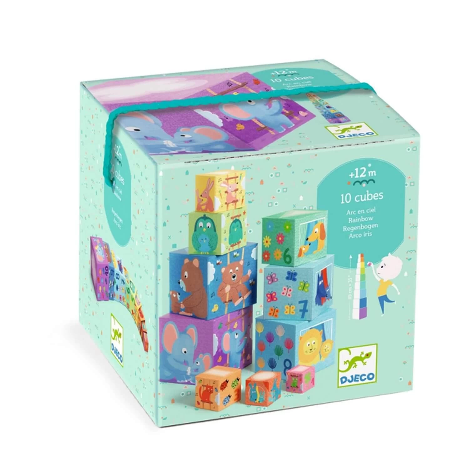 Contenu de la boîte : 10 cubes à empiler, emboîter, et faire tomber.
