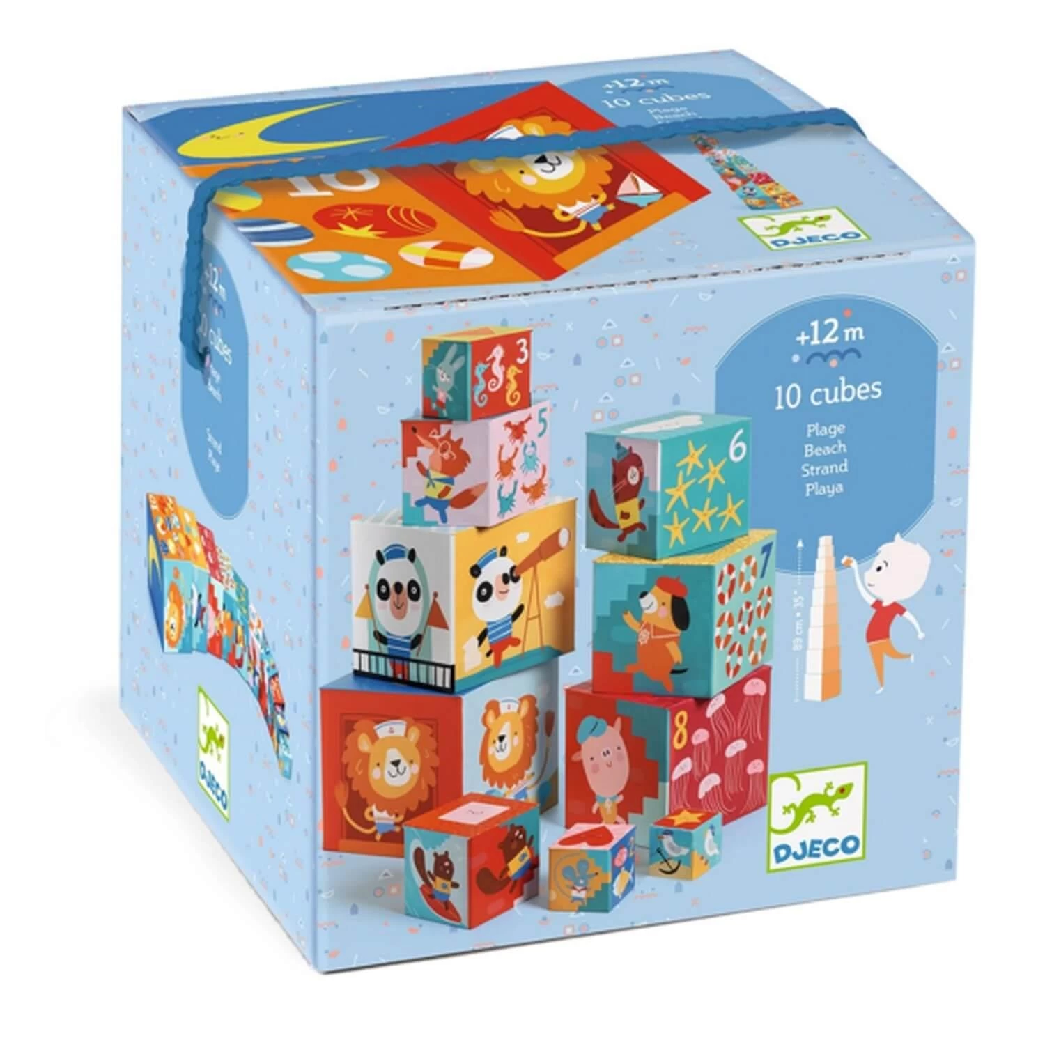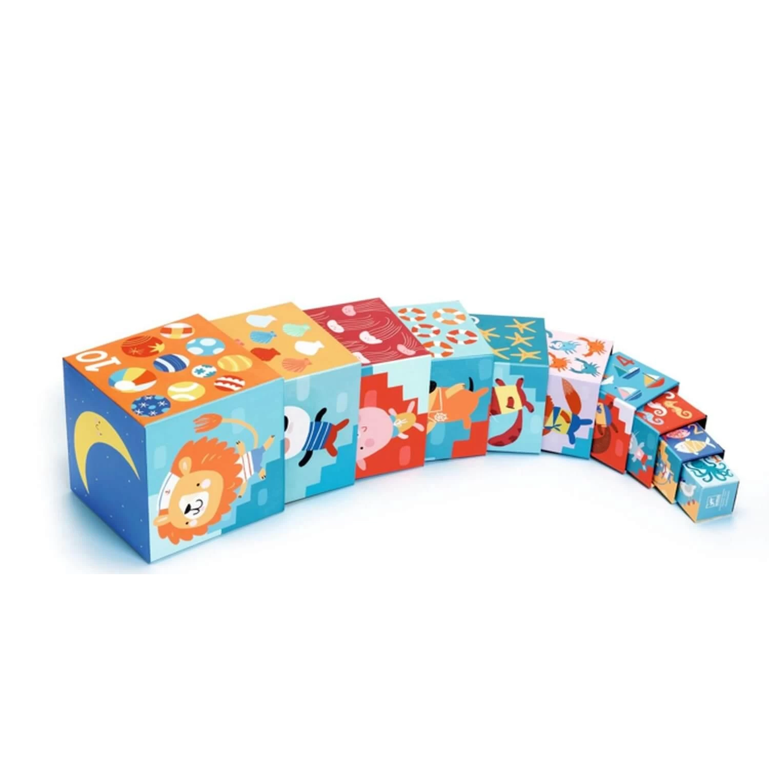 Contenu de la boîte : 10 cubes à empiler, emboîter, et faire tomber.