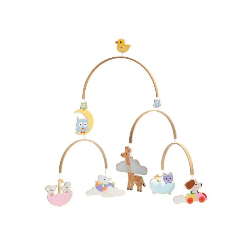 Rien de mieux qu’un mobile pour éveiller bébé dans ses premières découvertes. Ce mobile en bois viendra décorer la chambre de votre enfant avec douceur tout en l’éveillant aux couleurs et aux formes.