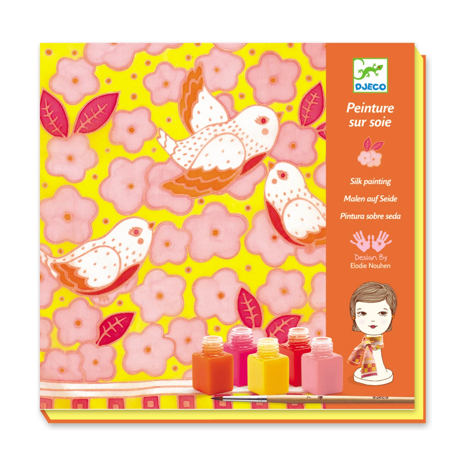 Petits artistes en piste ! La boîte ouverte devient un cadre sur lequel vous pouvez tendre l’écharpe en pure soie, à l’aide d’épingles. Puis, suis les tracés pour créer le foulard de vos mains. Magique ! Les tracés arrêtent la diffusion des encres. Une fois le foulard mis en couleur, fixe les encres avec un sèche-cheveu pendant 10 minutes environ. Après un rapide lavage à la main pour vérifier que les encres sont bien fixées, le foulard pourra passer à la machine à 40°.