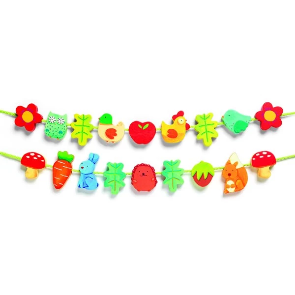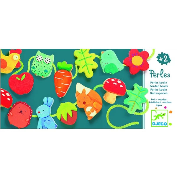 Contenu : 16 perles en bois sur le thème du jardin et 2 cordons.