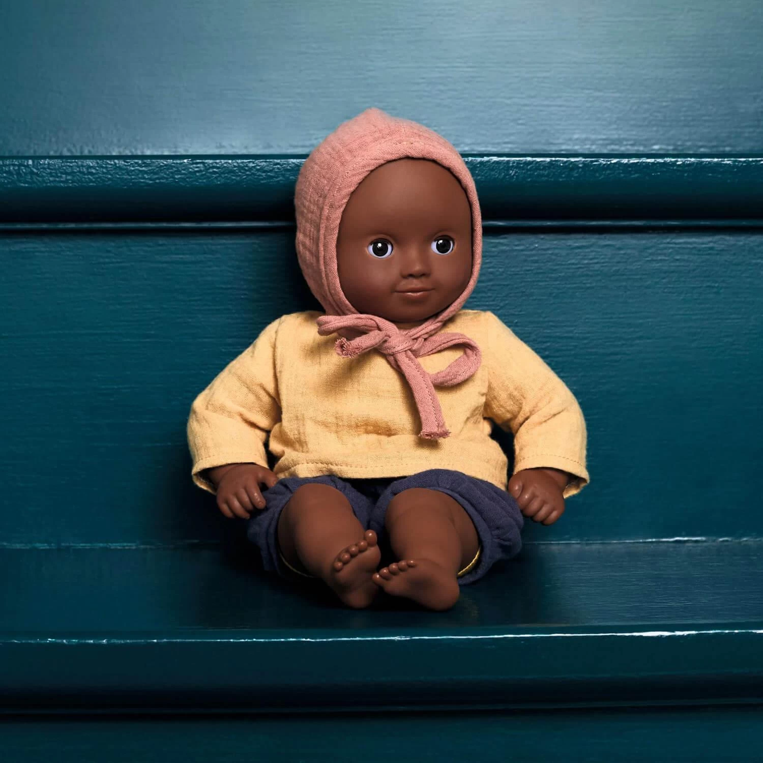 Avec ses beaux yeux noirs et sa tenue assortie, Baby Mimosa est une poupée pour les enfants dès 18 mois. Elle est légère et sa taille (32 cm) est parfaitement adaptée aux petits bras. Son corps souple est imprimé d’un joli “body”et permet de la positionner comme un vrai bébé. Son visage, ses bras et ses jambes sont en vinyle très doux, agréable au toucher. Avec ses yeux dormeurs, elle s’endort quand on la couche sur le dos. Ce poupon est habillé d’un bloomer, d’une chemise et d’un béguin en double Gaze 100 % coton. Contenu : 1 poupée de 32 cm (corps en tissu et tête, bras et jambes en vinyle), 1 bloomer, 1 chemise manches longue et 1 béguin.