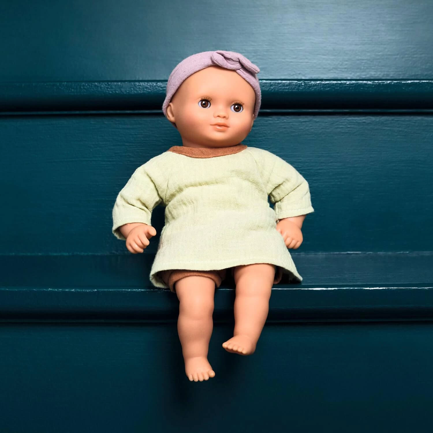 Avec ses beaux yeux marrons et son visage d’ange, Baby Pistache est une poupée pour les enfants dès 18 mois. Elle est légère et sa taille (32 cm) est parfaitement adaptée aux petits bras. Son corps souple, imprimé d’un body, permet de la positionner comme un vrai bébé. Son visage, ses bras et ses jambes sont en vinyle très doux, agréable au toucher. Avec ses yeux dormeurs, elle s’endort quand on la couche sur le dos. Ce poupon est habillé d’une robe et d’un bandeau sur la tête en belle matière double gaze 100 % coton. Contenu : 1 poupée de 32 cm (corps en tissu et tête, bras et jambes en vinyle), 1 robe, 1 bandeau.