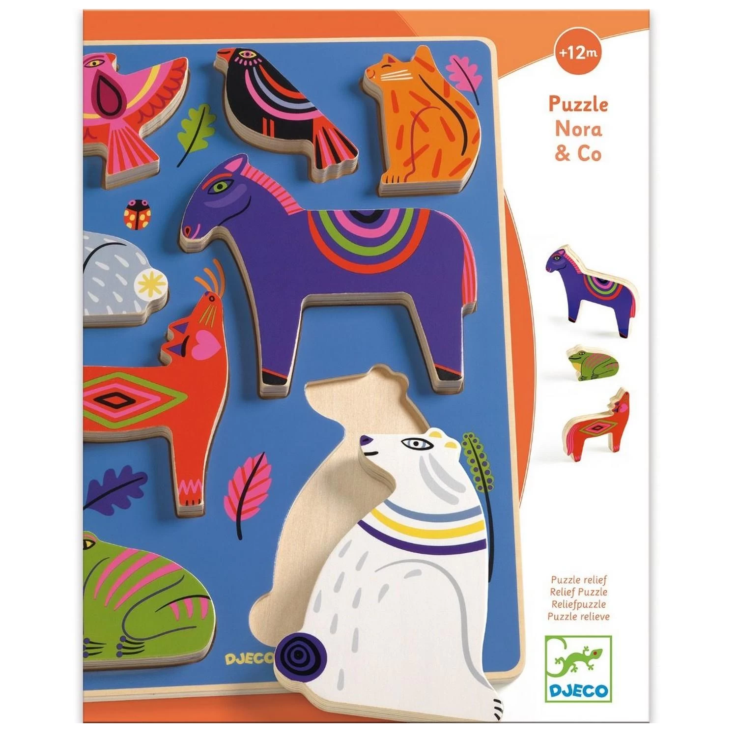 Nora & Co est un puzzle en bois facile à assembler sur le thème des animaux de la forêt. Les pièces en relief permettent à l’enfant de jouer avec les animaux. Des pièces larges qui sont faciles à attraper pour les petits. Les animaux tiennent debout, pour encore plus de jeu ! Vendu dans une boîte : pratique pour offrir et pour ranger.