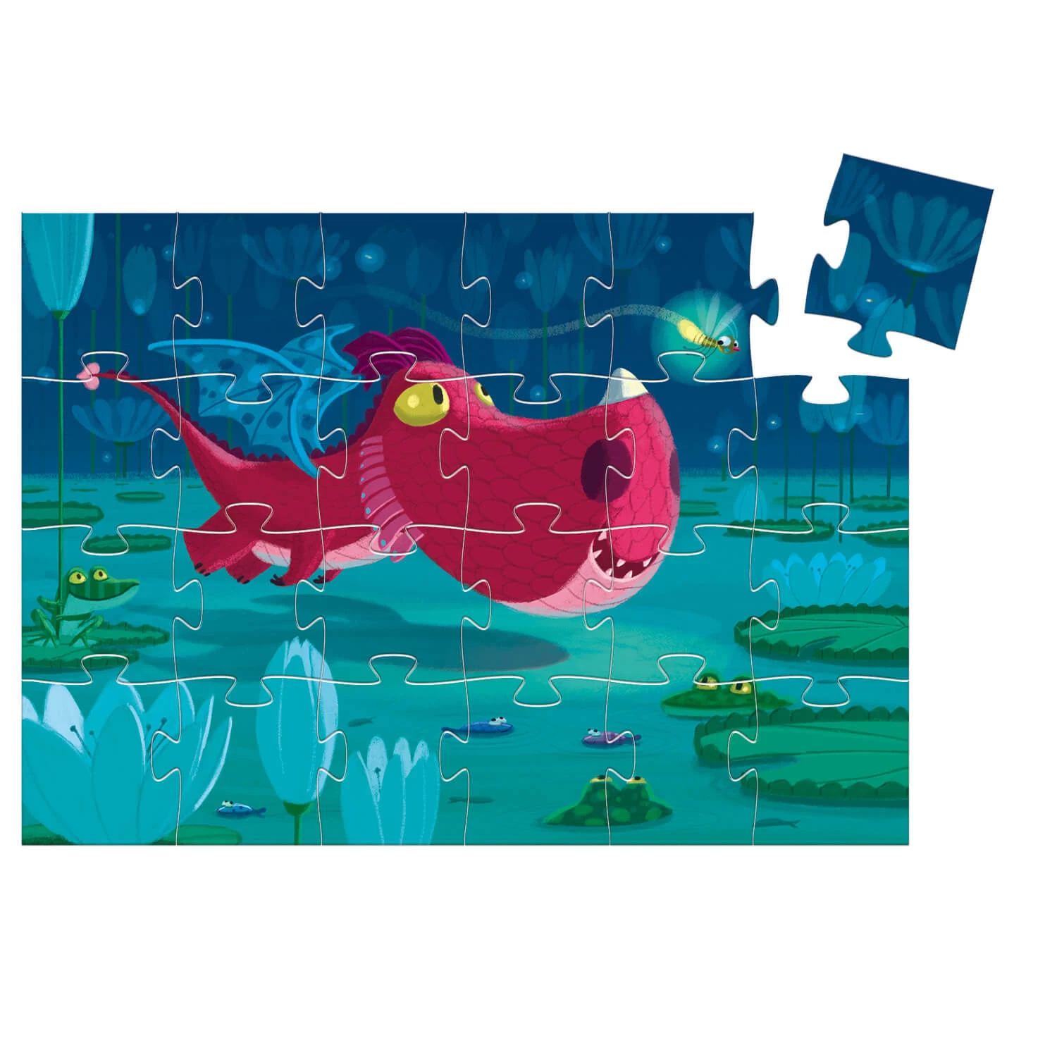 Edmond est un gentil dragon, tout rose avec des grands yeux jaunes. Dans ce puzzle, il vole au-dessus de l’eau en pleine pénombre en compagnie des grenouilles.
