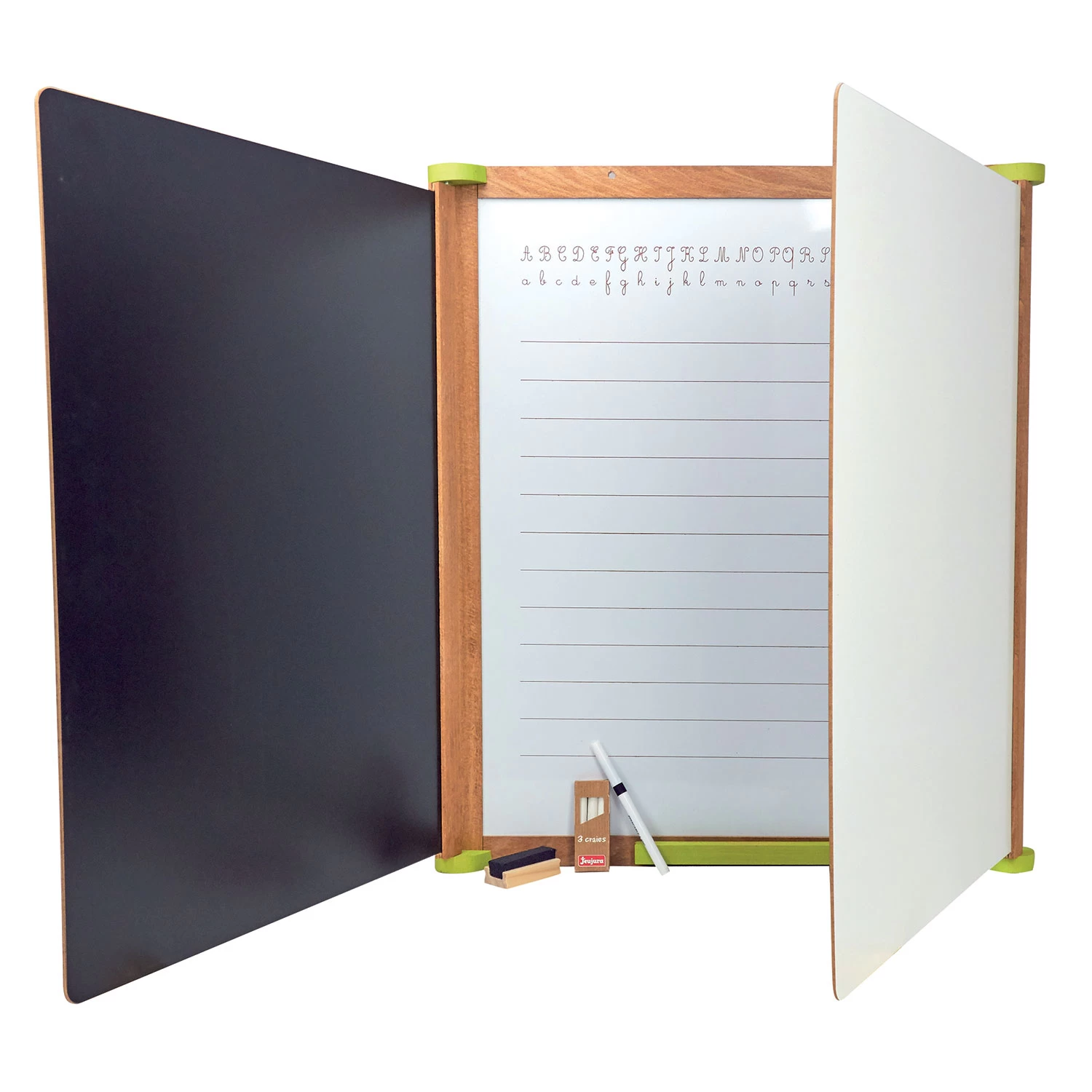 Très beau triptyque en bois dont l’ardoise centrale est magnĂ©tique et sĂ©rigraphiĂ©e accessoirisĂ©e d’un plumier en bois vert. Les deux volets disposent d’une face pour la craie et une face pour feutre effaçable Ă sec.