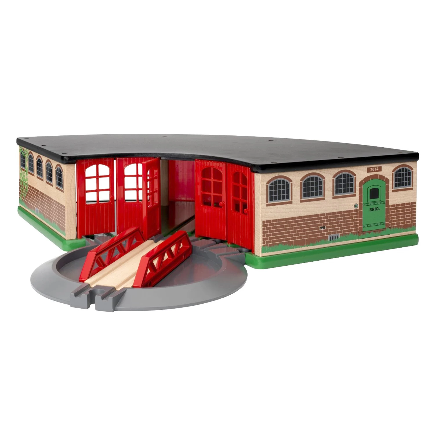 Utilisez la plaque tournante mĂ©canique pour orienter les trains vers leur voie de garage. A l’arriĂšre, de grandes portes coulissent pour pouvoir accĂ©der aux trains.