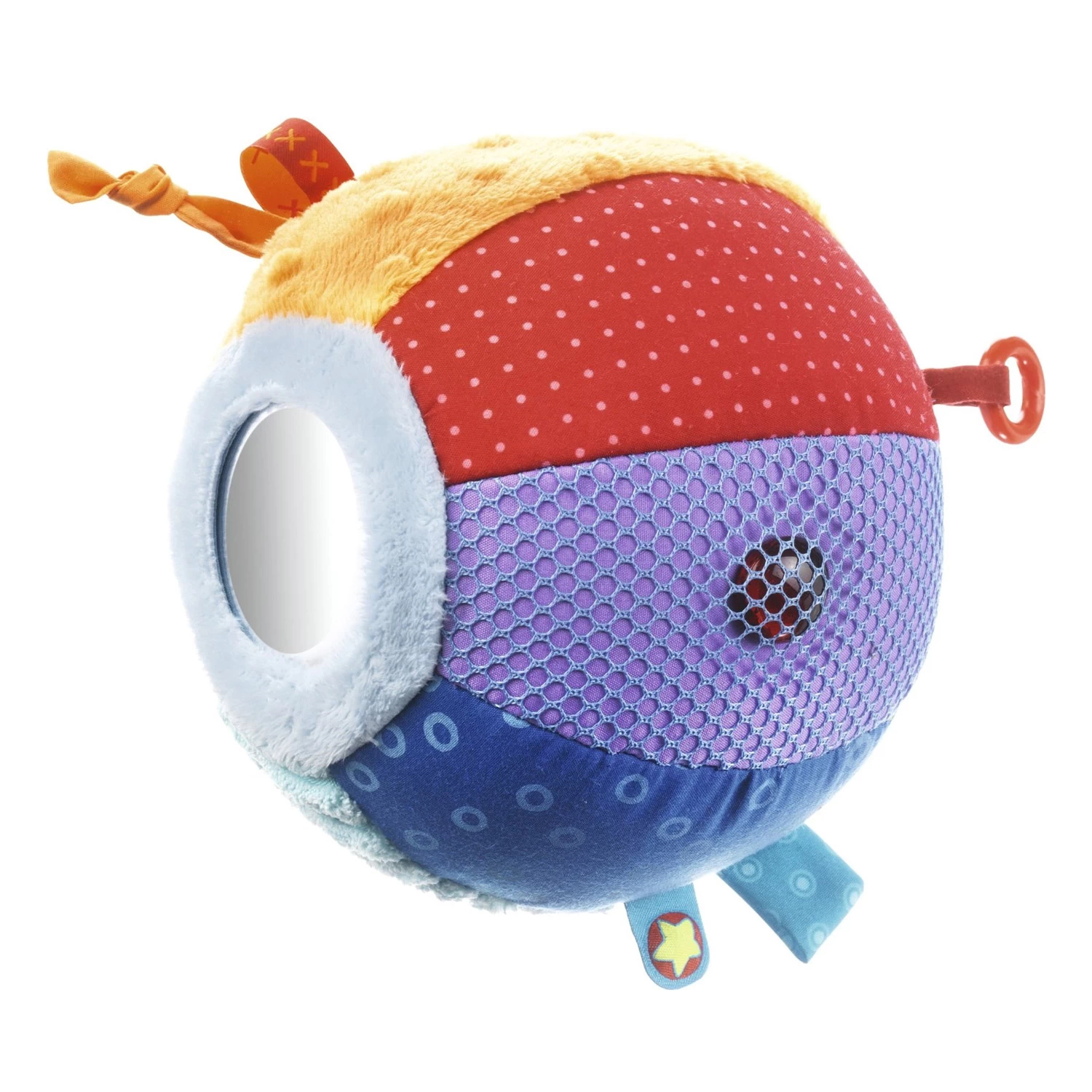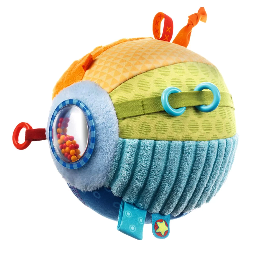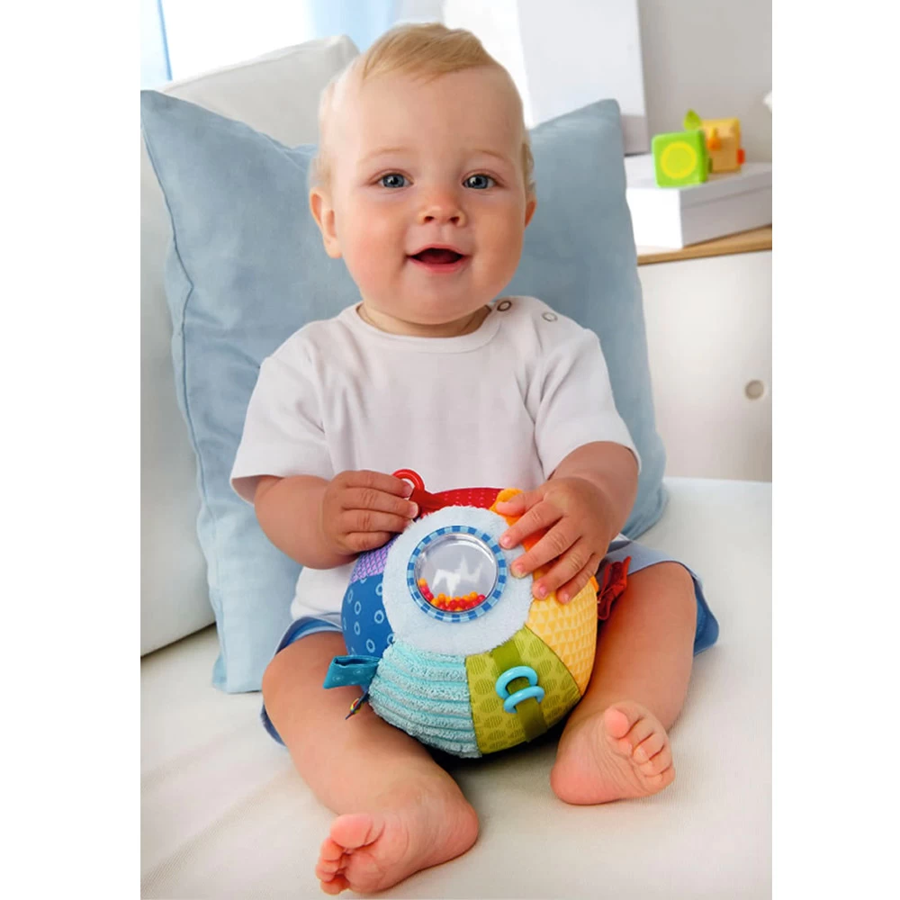 La balle découverte De toutes les couleurs est conçue pour éveiller les sens des enfants à partir de 6 mois. Dans un premier temps, ces derniers sont incités à ramper afin de l’attraper. Puis, une fois l’objet entre leurs mains, ils pourront explorer et manipuler tous les éléments qui la composent : un noeud, un filet, trois anneaux, un petit miroir, une capsule remplie de billes colorées, etc.