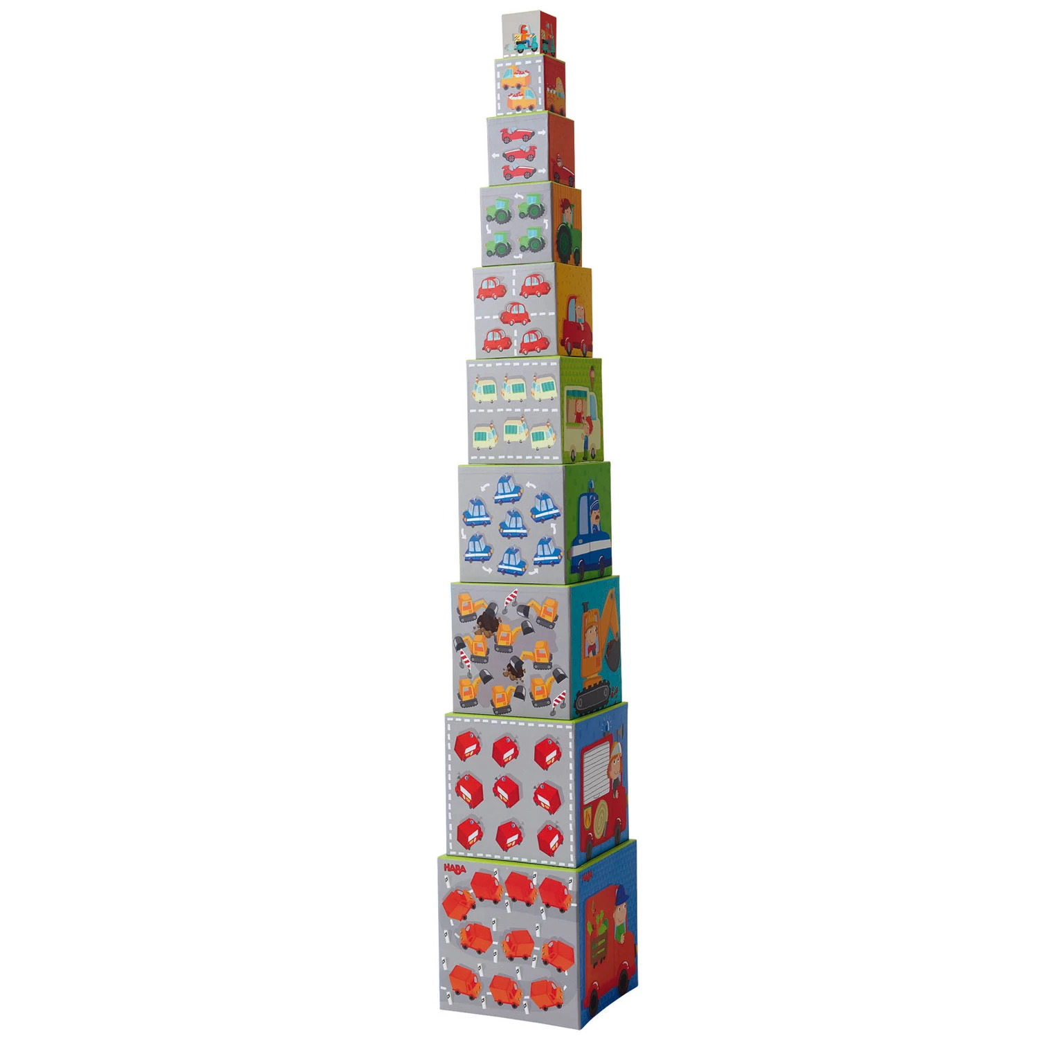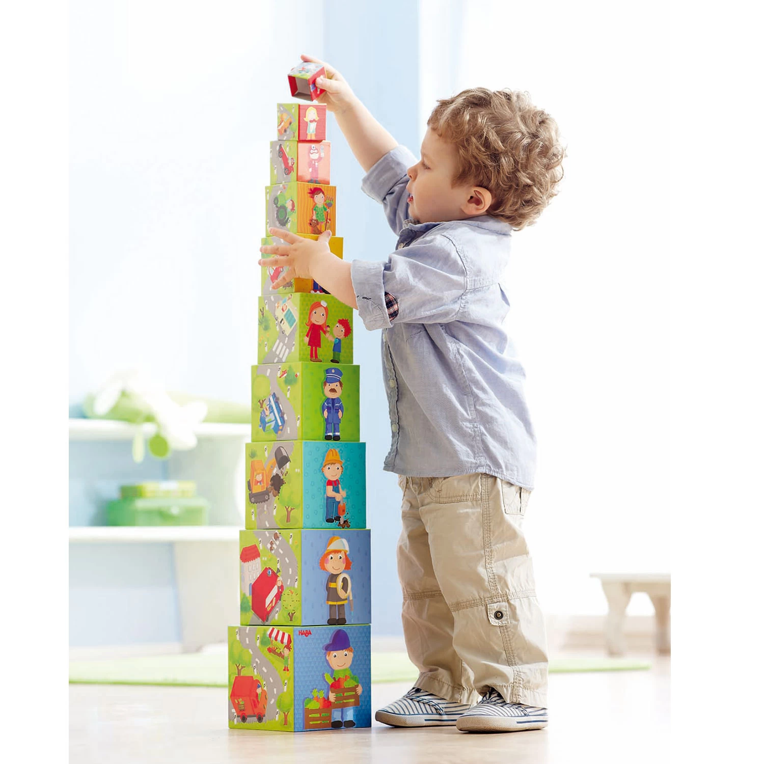 Vous avez deux options de jeu : soit vous les empilez dans l’ordre décroissant, de manière à former une grande tour stable ; soit vous les insérez les unes dans les autres, toujours dans l’ordre décroissant. L’enfant apprendra ainsi la notion de grandeur, d’équilibre, les chiffres et il apprendra à compter.