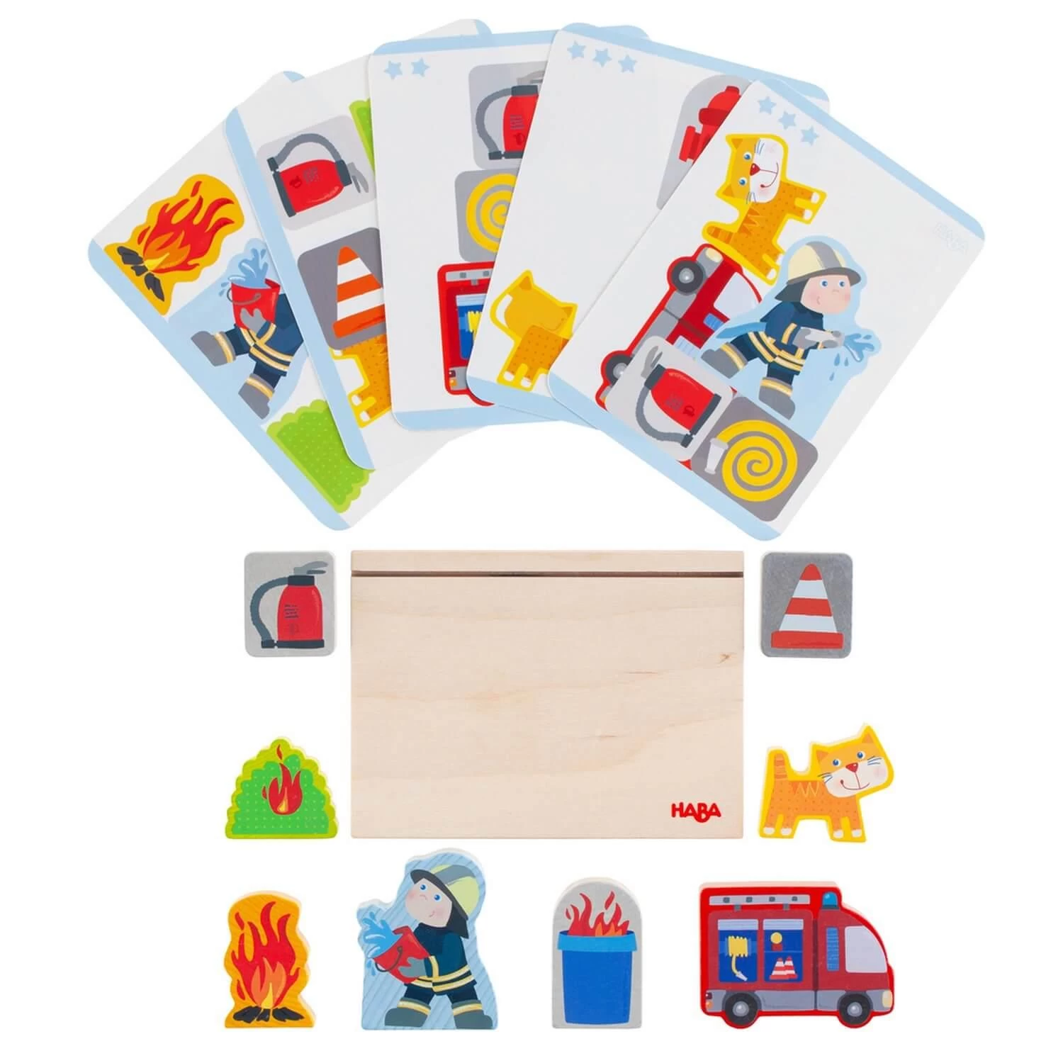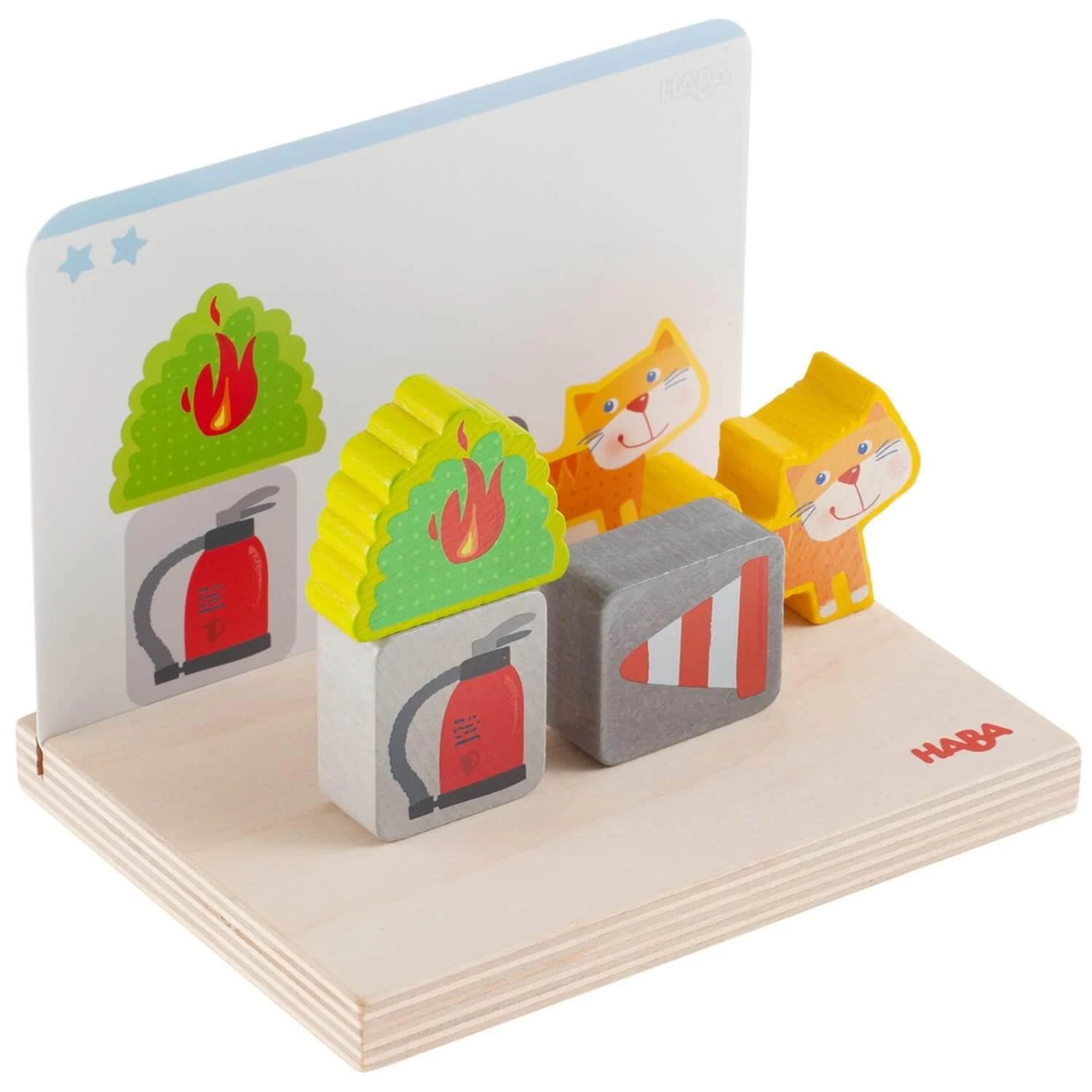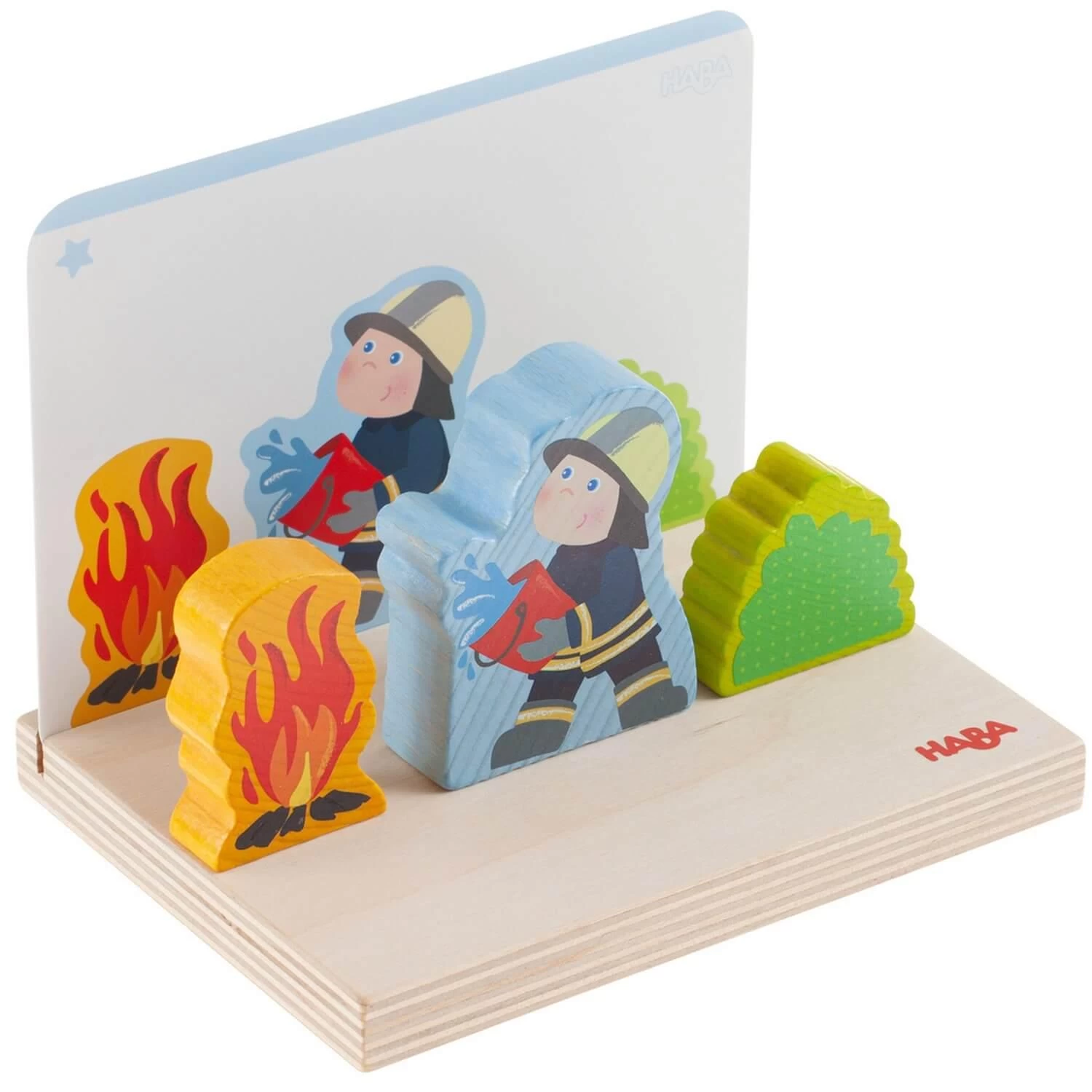 Découvrez le superbe jeu à empiler en bois 3D pompiers de la marque Haba.