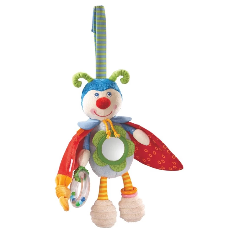 Grâce à sa solide attache velcro, la coccinelle peut se suspendre facilement aux barreaux du lit ou du parc, mais aussi à la poussette, au transat et au siège auto.