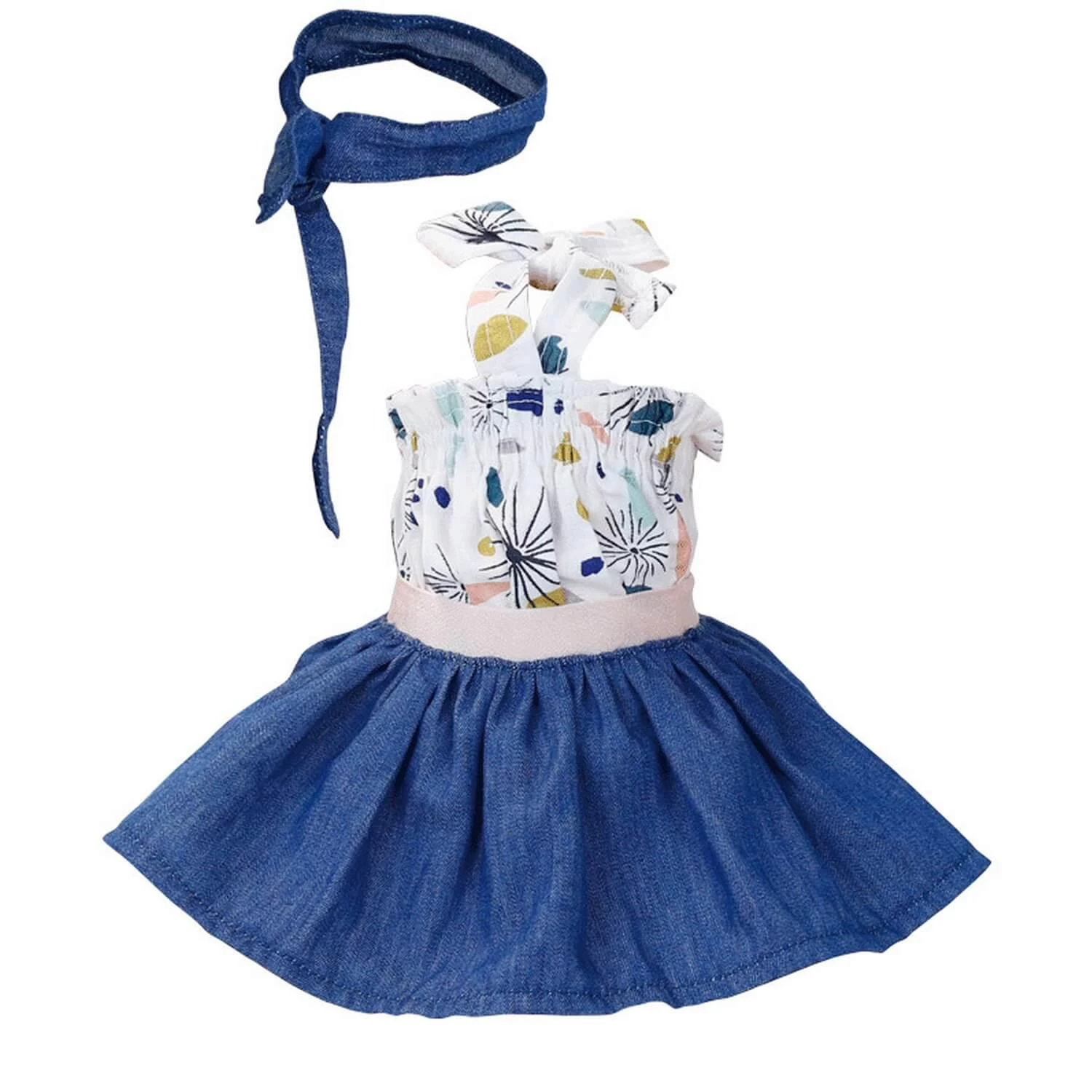 La tenue se compose d’un maillot bustier fleuri, d’une jupe bleue et d’un bandeau pour cheveux bleu. Un accoutrement, qui va rendre la poupĂ©e de votre enfant Ă©lĂ©gante.Â