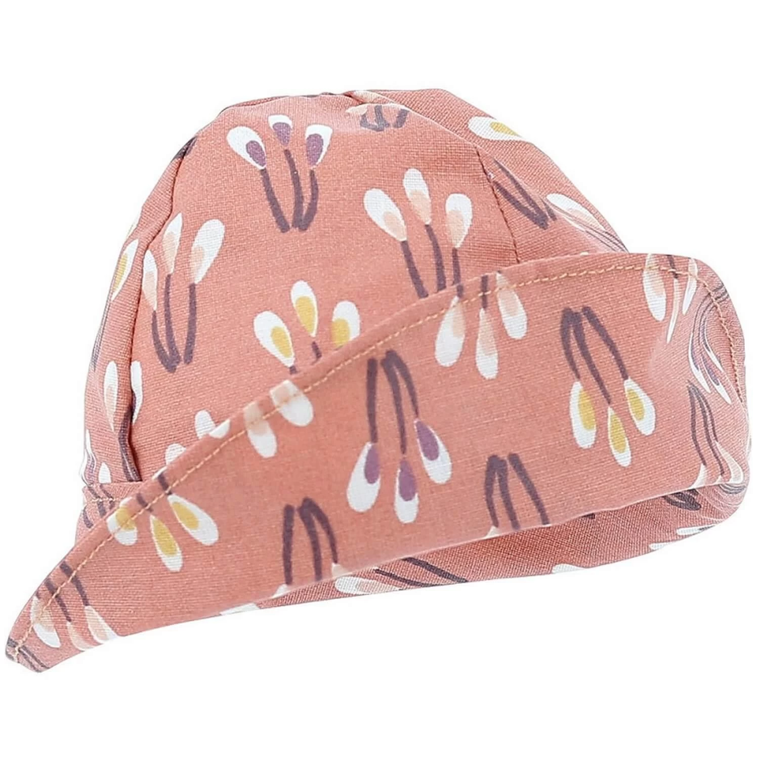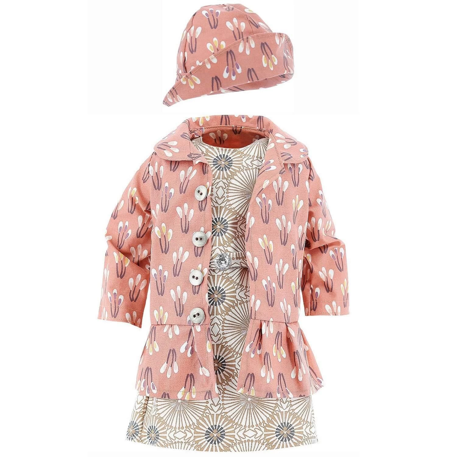 La tenue se compose d’une robe, d’une veste longue et d’un chapeau rose. Le chapeau est la veste ont le même imprimé dans les tons roses, la robe est dans les tons beige. Il y a un volant sur le bas de la veste.