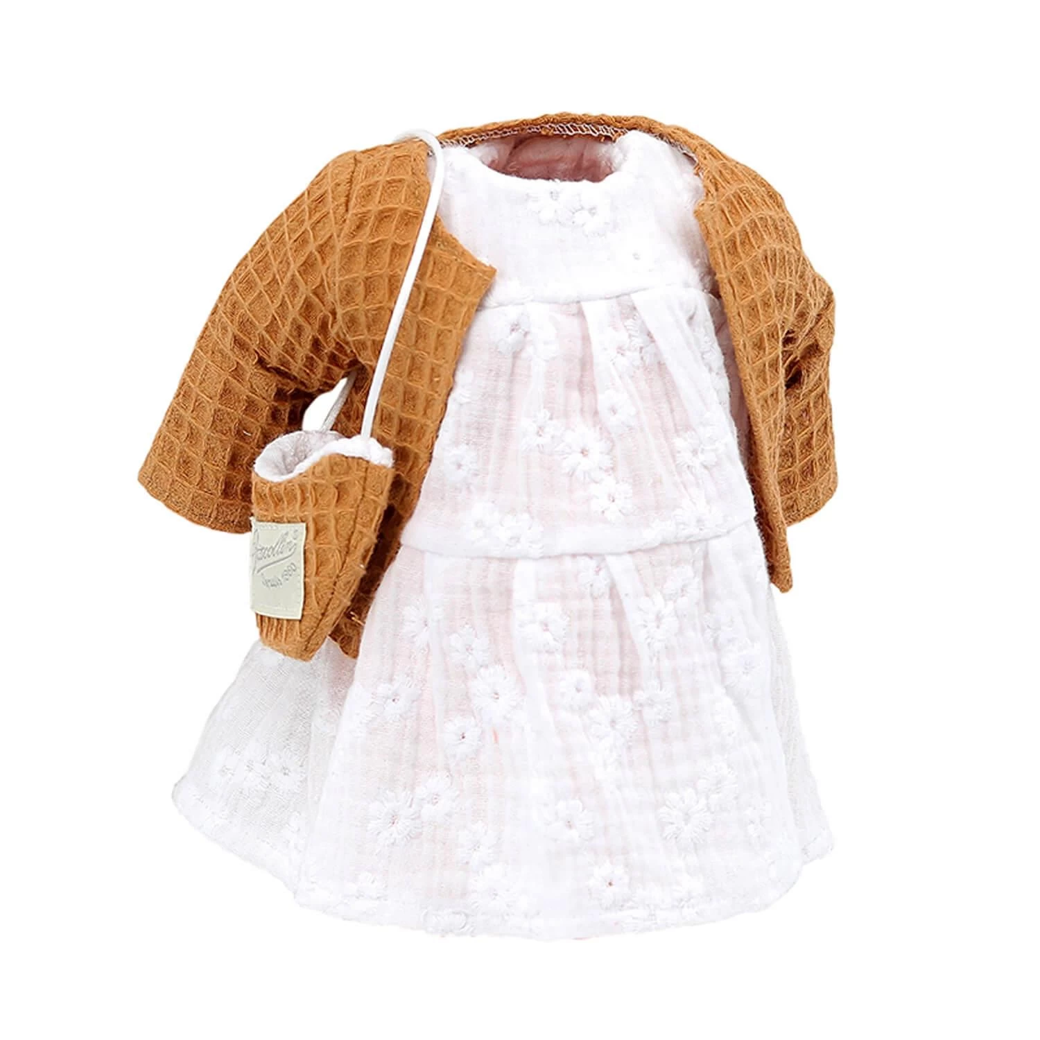 Cette tenue est composée d’une jolie robe blanche en broderie anglaise, d’un gilet de couleur ocre avec son sac assorti. Une tenue qui sera parfaite pour habiller votre poupée Petitcollin cet été !