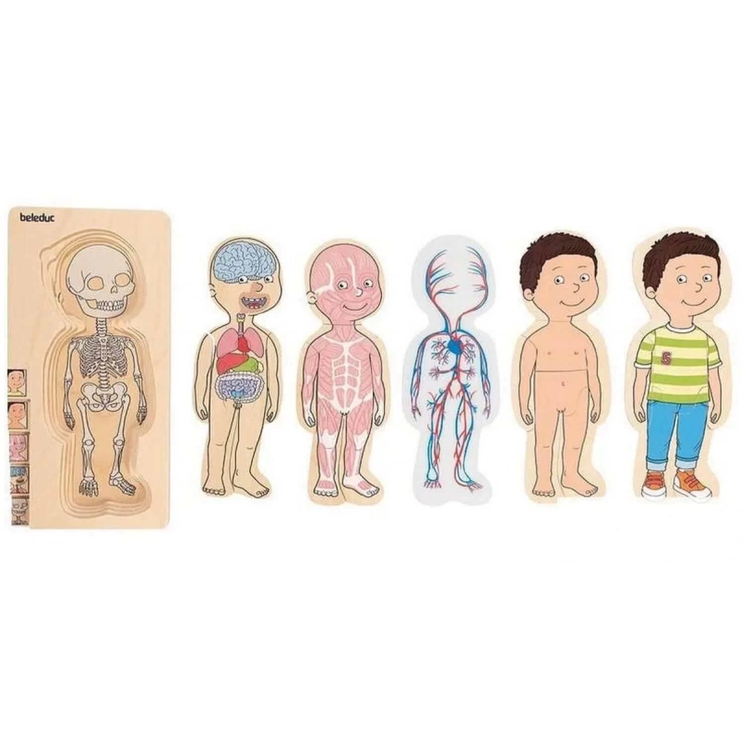 Un puzzle en bois multi-niveaux de 29 pièces : Puzzle du corps humain “Garçon”, de la gamme Beleduc de la marque Hape.
