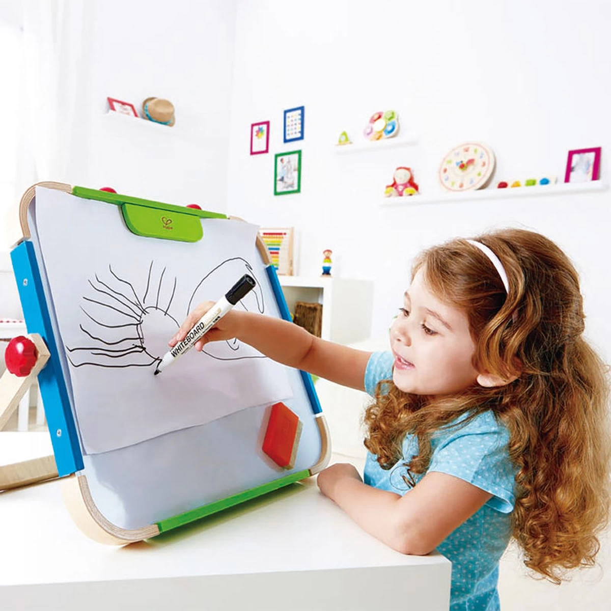 Ce studio artistique multifonction gardera les artistes bien occupés. Il comporte d’un côté un tableau blanc magnétique sur laquelle ils pourront écrire ou dessiner au feutre et un tableau noir pour dessiner à la craie. Posé sur un pied, le tableau est incliné pour donner plus d’aisance aux petits artistes et donc faciliter le dessin.