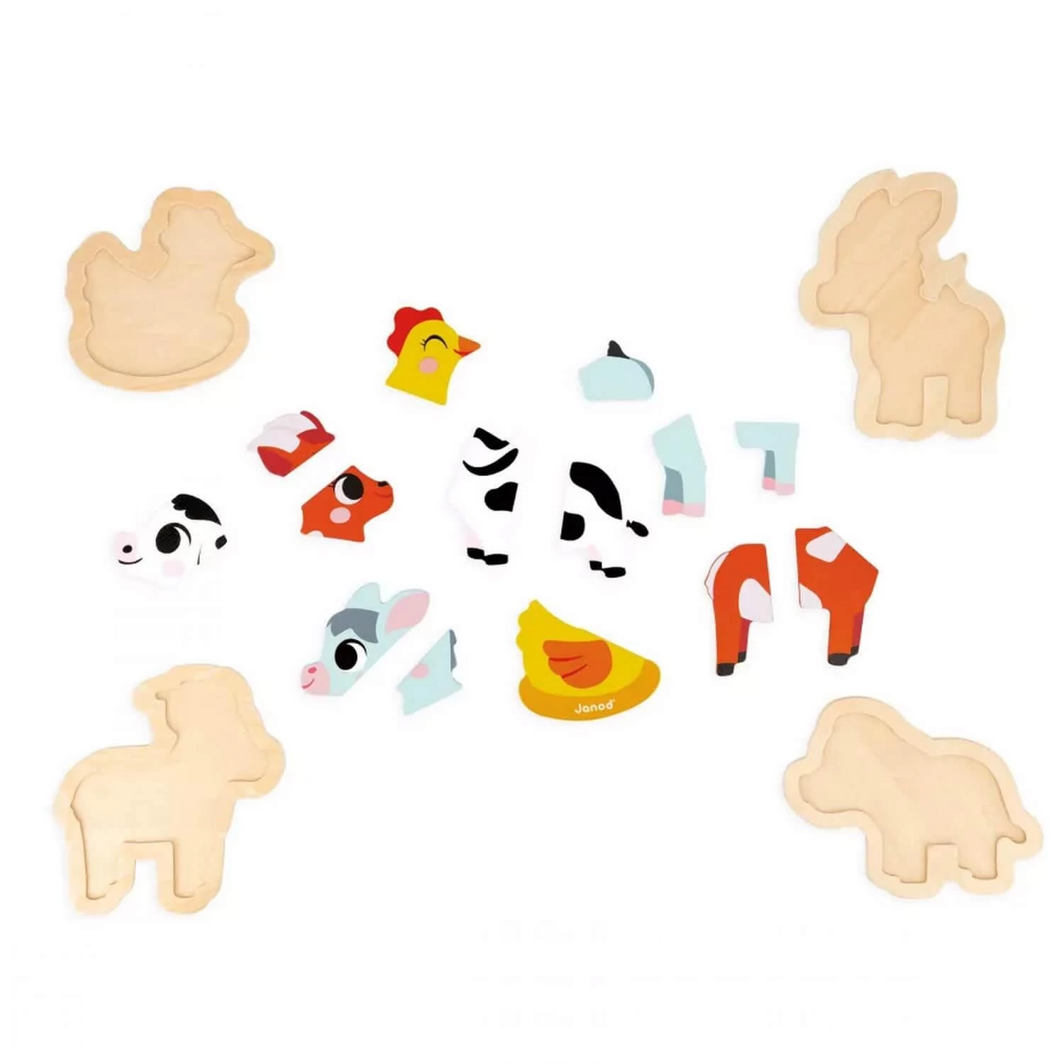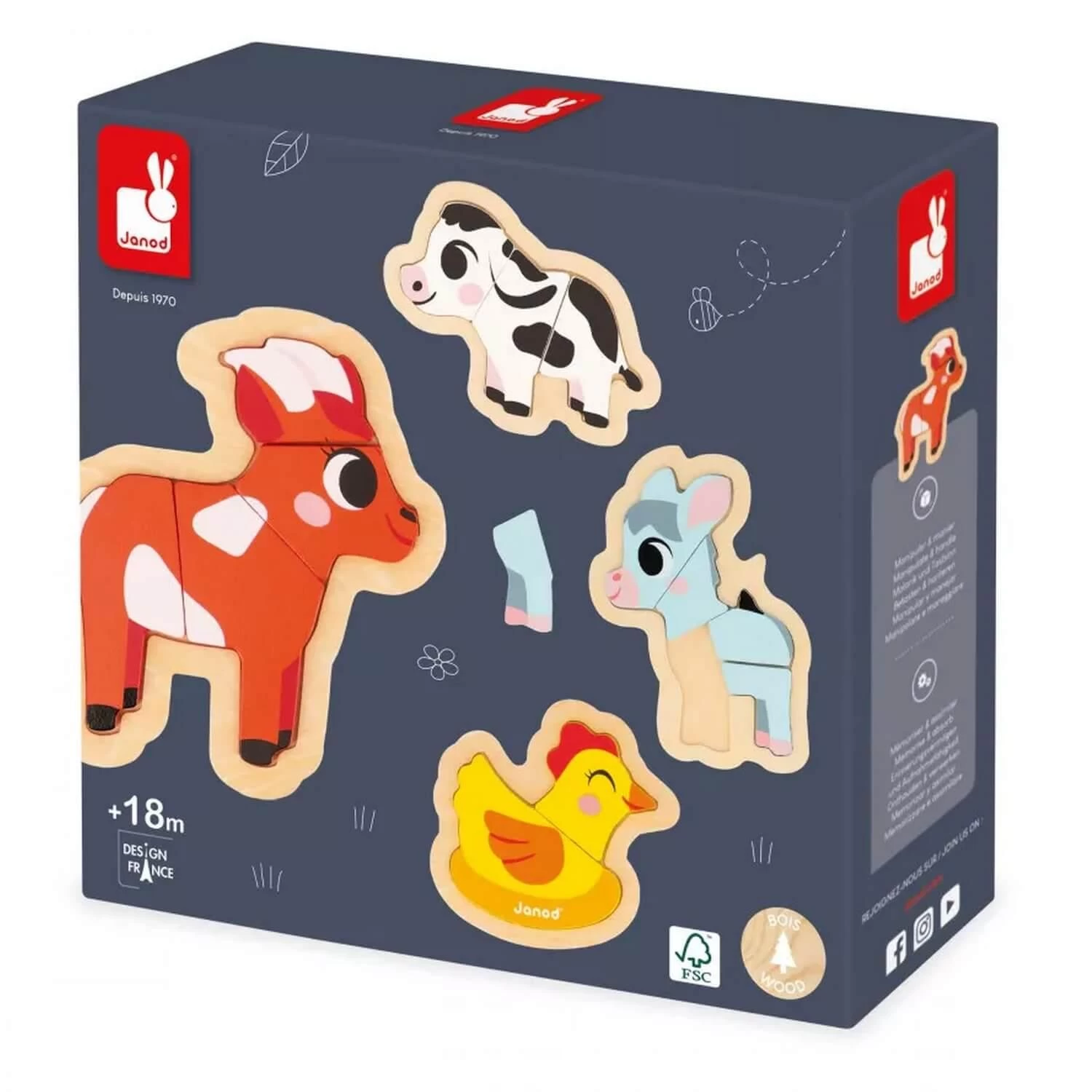 On retrouve les animaux favoris des tout-petits : une poule de 2 pièces, une vache de 3 pièces, une chèvre de 4 pièces et un âne de 5 pièces. Les pièces à replacer dans le bon ordre sur un support en bois sont suffisamment grosses pour que bébé puisse bien les prendre en main.