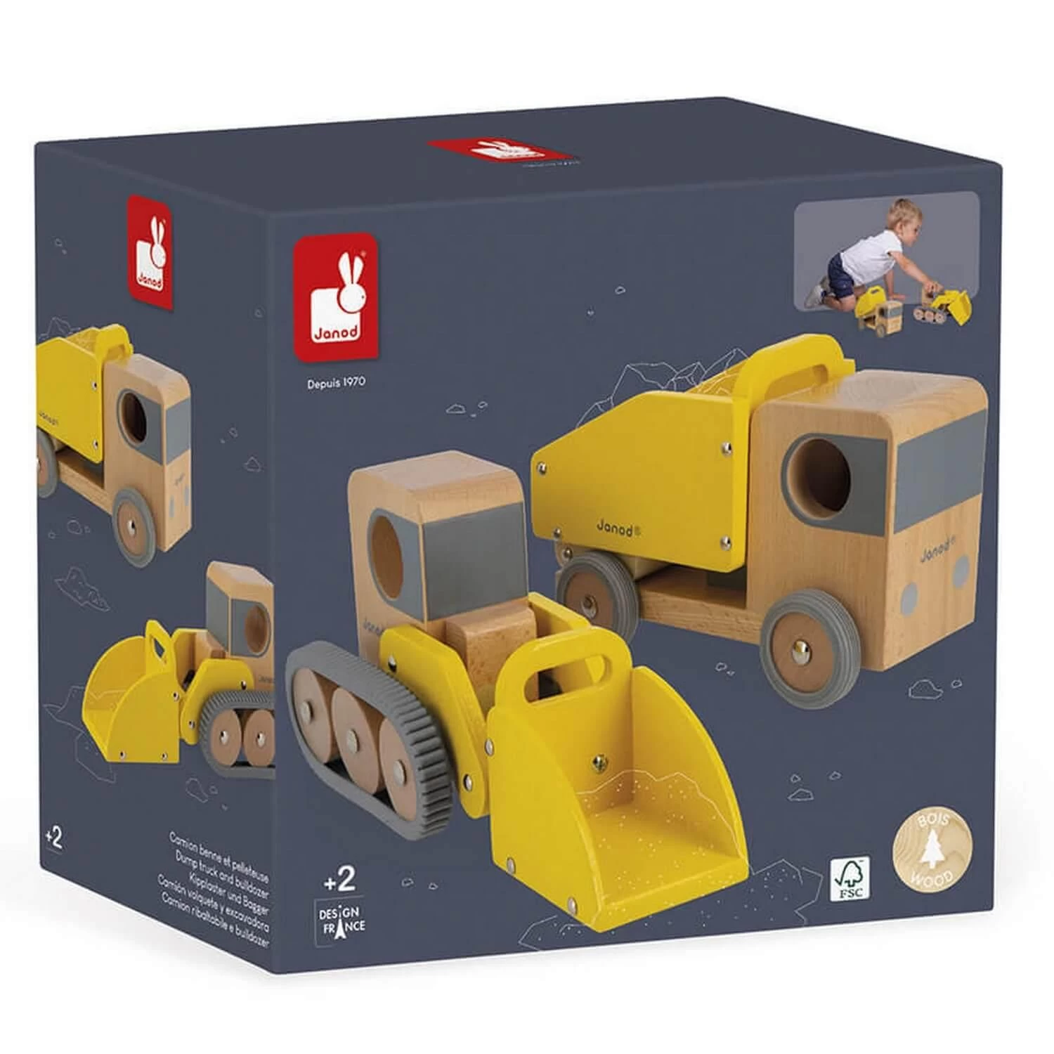 Ce jouet est fabriqué en bois certifié FSC® et peint à l’eau dans des tons de jaune lumineux ! Ces véhicules ont un grand format (pelleteuse 28,8 x 12 x 13,5 cm et camion benne 22,6 x 12 x 15,2 cm) et sont donc robustes et faciles à manipuler par les petites mains.