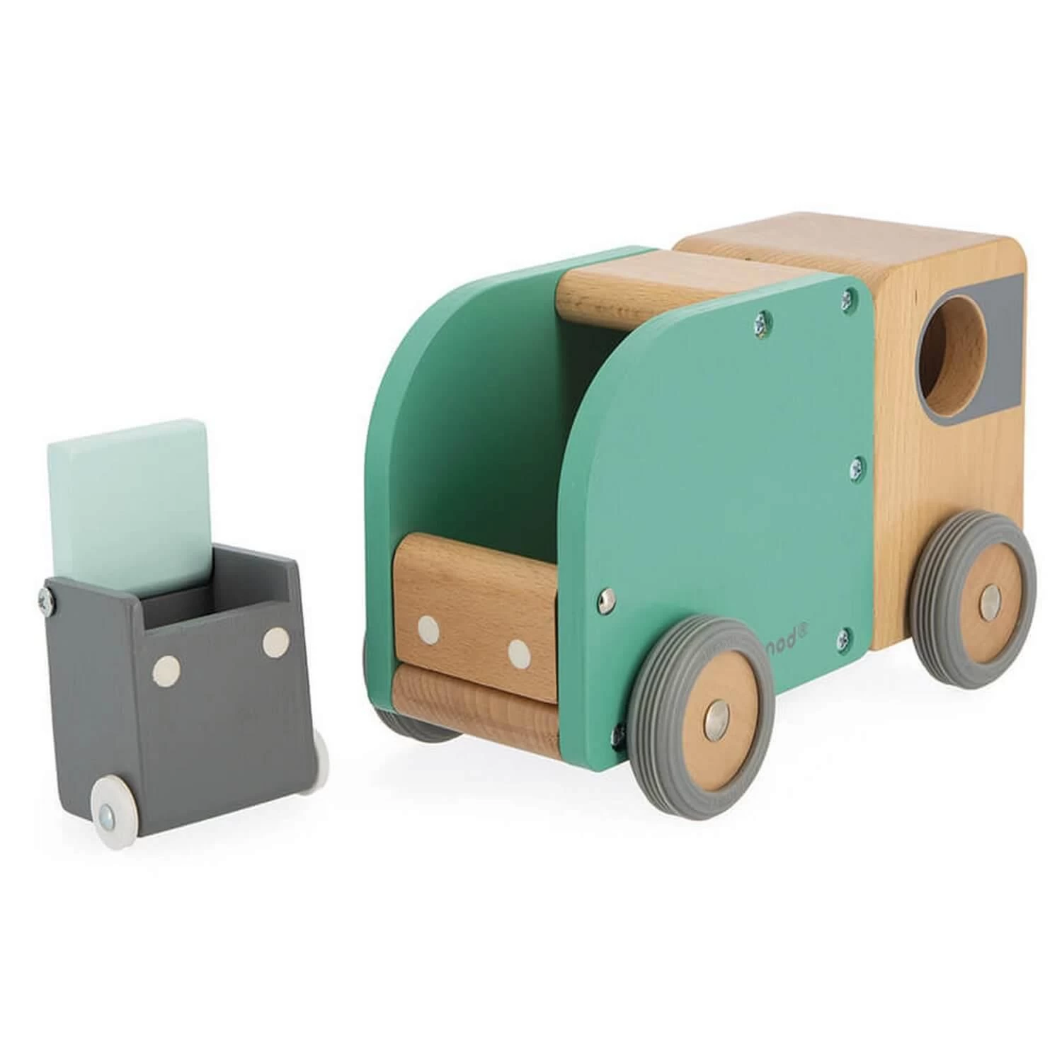 camion vert, gris et en bois, est accompagnĂ© d’une poubelle aimantĂ©e qui