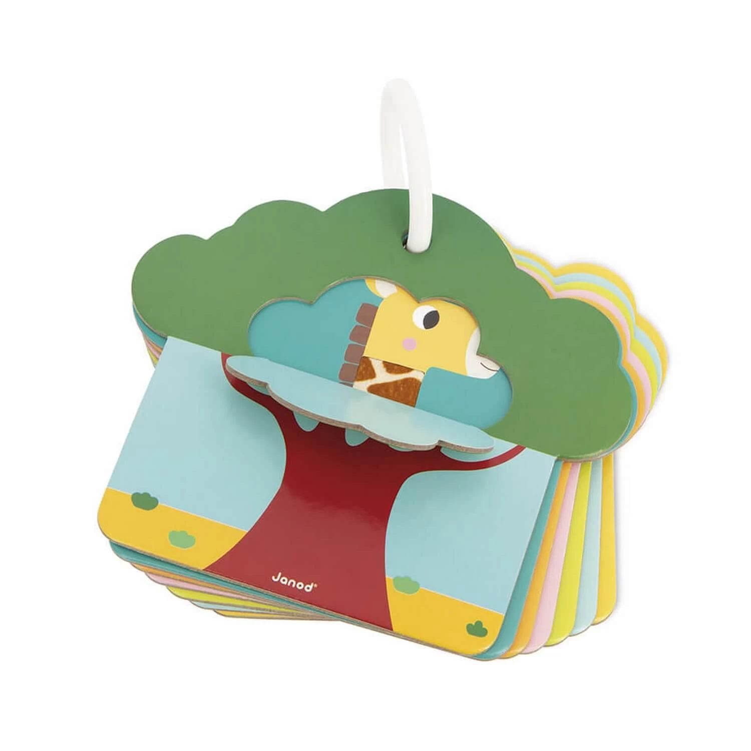 Ce set contient 6 cartes animaux avec des matières à toucher liées par un anneau amovible pour maintenir les cartes et les transporter partout facilement. Une carte ‘arbre’ avec ouverture sur le devant permet également de jouer à cache-cache avec les cartes.
