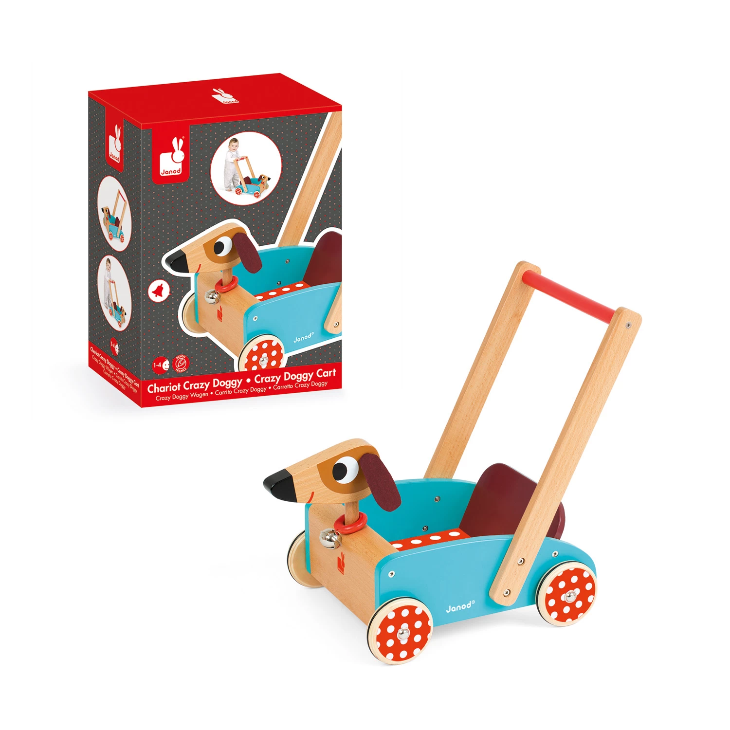 Offrez à votre tout-petit ce joli chariot en forme de chien et en toute stabilité il va pouvoir faire ses premiers pas en toute confiance. En plus, il pourra transporter ses jouets préférés et écouter le son de la cloche retentir!