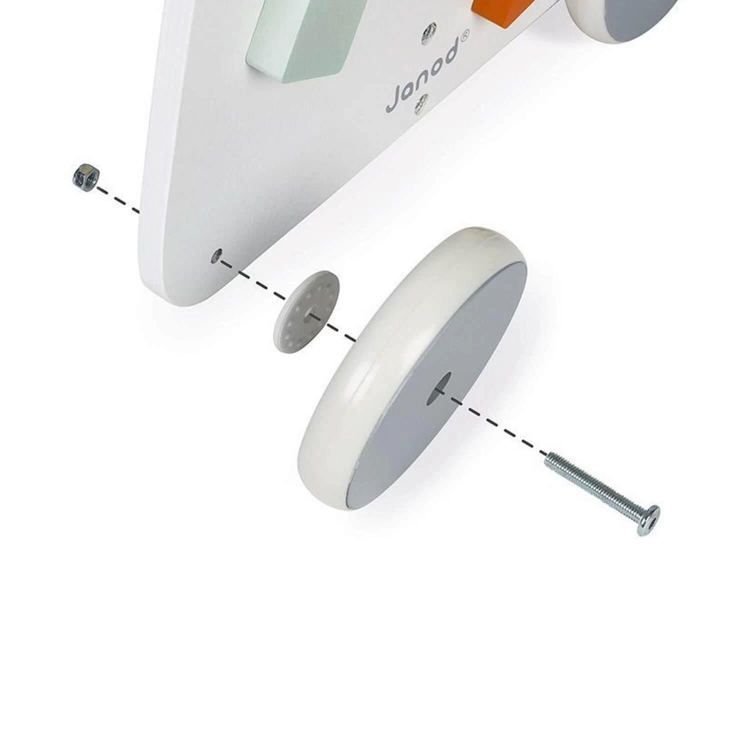 Très astucieux, il est équipé d’un tapis en feutrine pour atténuer le bruit et amortir la chute des cubes. Enfin, ses roues sont silencieuses ! Si on ajoute à tout ceci, son design contemporain et ses couleurs douces, on ne peut que craquer ! On aime le bois naturel, le blanc et le gris, mis en valeur par les détails colorés des nombreuses activités de ce chariot premier âge pour bébé !