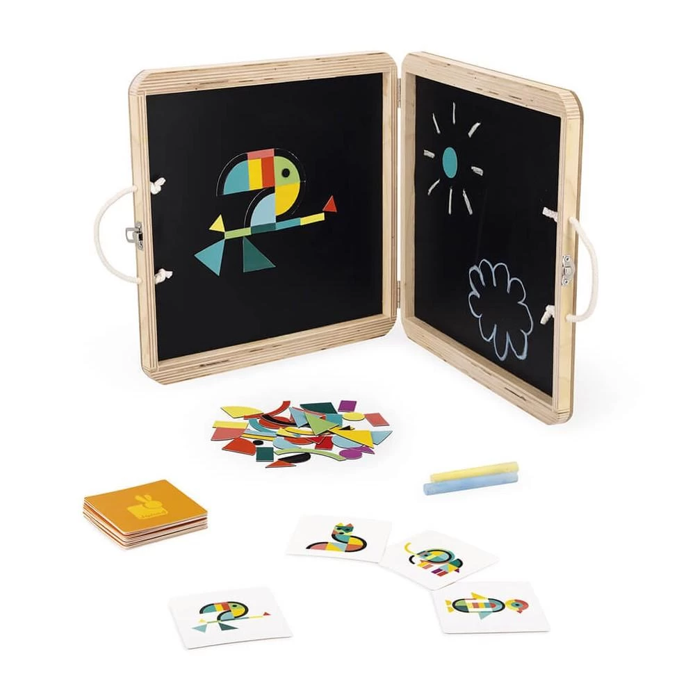 Avec ce coffret Janod on se familiarise avec les formes en s’amusant. Ce jeu éducatif en bois permet également de laisser libre court à son imagination et de travailler la motricité grâce aux surfaces ardoise et aux 2 craies blanches fournies. Aux enfants de laisser parler leur imagination, comme s’ils dessinaient sur un tableau !
